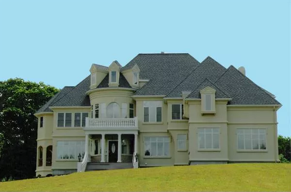 A conical turret atop concrete pillars and arched windows presents a venerable facade. The entry hall, opening through double doors, is garnished with a sumptuous curved staircase. The living room lies straight ahead, featuring an ornate vaulted ceiling. A guest suite and sunken library on the left each open to a charming loggia, bestowing panoramic views. A stunning solarium to the right of the living room employs skylights to wondrous effect. A circular breakfast nook lies adjacent, diagonal to the comfortable keeping room. The upper level confers dramatics views of the keeping and living rooms, and of the foyer below. The master suite offers a lesson in resplendence; a three-sided fireplace, private sitting room, and angled bath with free-standing, oversized tub.