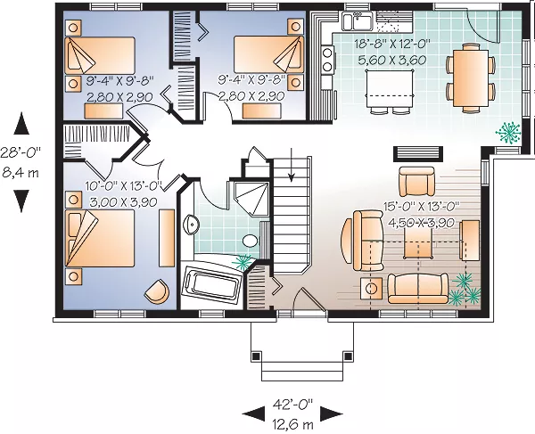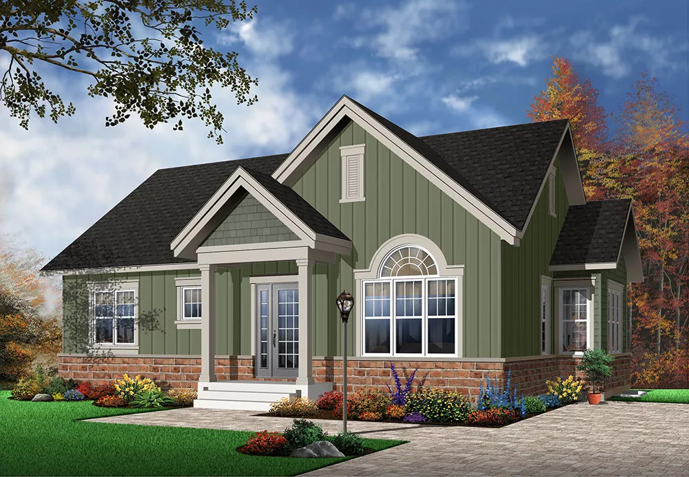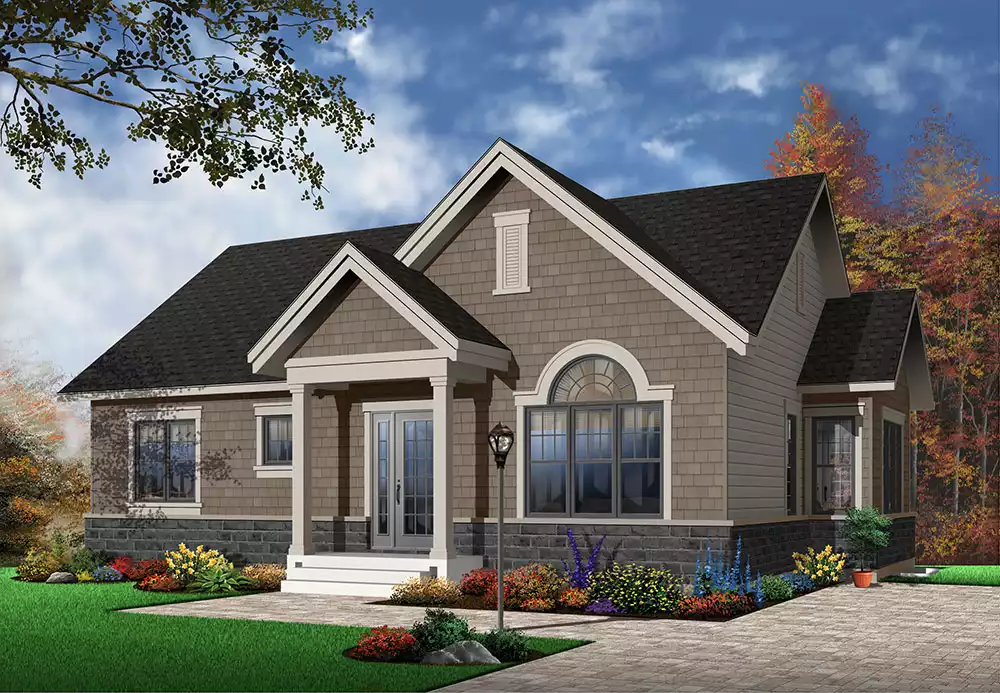 A covered entry, stone and shingle siding create a glowing welcome to this traditional cottage. Inside, we find a flowing semi-open activity area, with the living room highlighted by a partially vaulted ceiling to capture light from the arched feature window. The kitchen with island is within easy reach of a charming dining area, which is surrounded by windows on three sides. The bedroom area is separate from the main living area and boasts three comfortable bedrooms including a forward-oriented master bedroom with large closet. The bathroom features a corner shower and independent bath. A full basement allows for further development possibilities.
