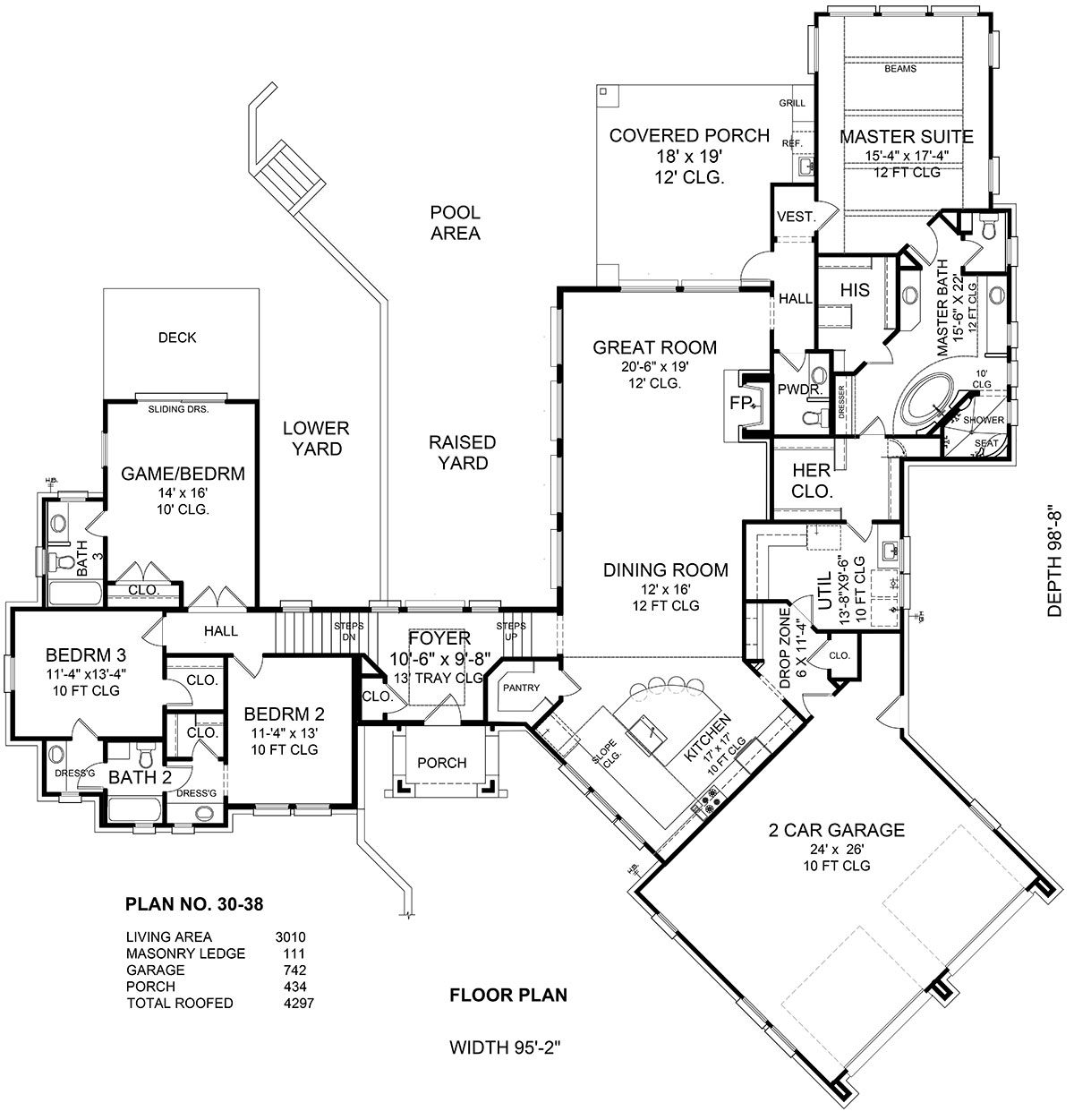 With 3,010 square feet of living space, this contemporary ranch style plan is one that you have to see to believe. A sprawling stately floor plan offers a home that has great areas of togetherness, coupled with private spaces for when you need to get away. A covered front entryway is tucked away from the 2-car garage. A grand foyer is the true center of this home, providing access to all wings of the property. The left-hand wing is home to 2 bedrooms including separate walk-in closets and a full shared bathroom.  A game room and full bathroom are also located here and can double as a spare bedroom or office if necessary. A rear deck is accessible via sliding glass doors and moves in to the lower yard of the property. The opposite wing of the home finds most of the living spaces, including a spectacular eat-in island kitchen, as well as a formal dining and great room. The great room opens on to a covered porch, followed by a hidden gem, your very own pool area!  The final amazing piece of this home is the magnificent master suite. An almost 300 square foot bedroom joins with massive his and hers separate walk-in closets and a spectacular spa style bathroom to create a truly relaxing and care-free space. A nearby laundry room is easily accessible for chores. From start to finish, prepare to be amazed at all that this home has to offer to make your life easier and fun every day.