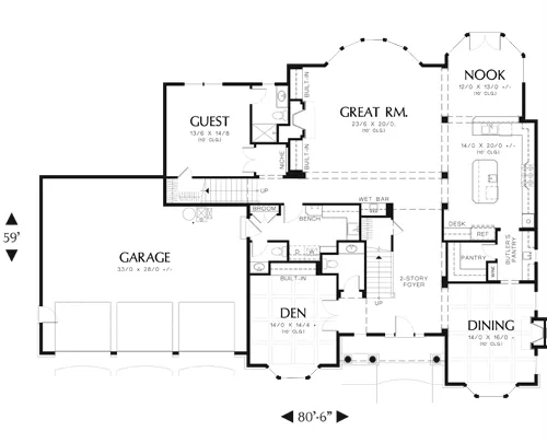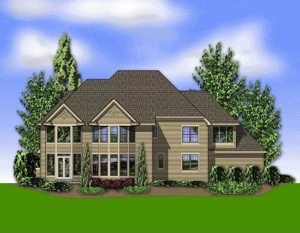 Four bedrooms and three full baths join a library and a games room on the upper level. The master suite is vaulted and has a bow window and spa bath with walk-in closet. The games room sports a wet bar. Other details of note: a wet bar across from the great room, built-in shelves and niches, and a butlers pantry with walk-in storage pantry connecting the dining room and kitchen.