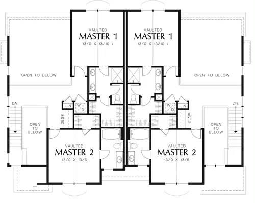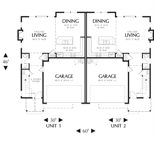 Separately styled entries help distinguish the two complexes of this multifamily home. One features a portico with decorative stick-style braces, while the other features a flat-roofed porch. Both entrances lead to a two-bedroom, two-story floor plan inside. The kitchen, dining room, and living room share open space and treat occupants to a fireplace, island snack bar, and views to the back through windows in the dining room and the living room.