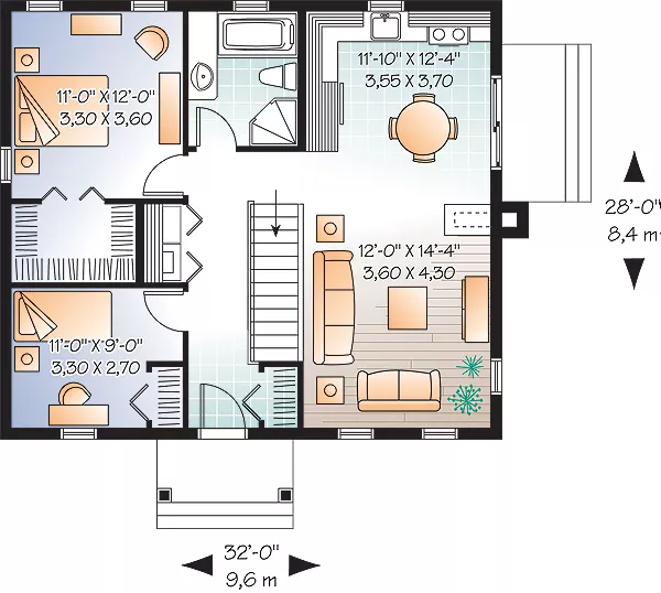 A covered entry graces the front of this demure 896 sq. ft. cottage. Economical, efficient and easy to build, this is an incredible starter home or empty nester. A three-sided fireplace separating the living room from the kitchen/dinette area accents the living area. A master bedroom includes a surprisingly generous walk-in closet providing great acoustic separation from the secondary bedroom. Both bedrooms have convenient access to a four-piece bathroom complete with independent shower. A laundry closet is located close to both bedrooms and a basement offers storage or expansion options.