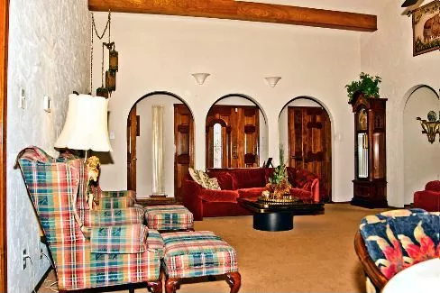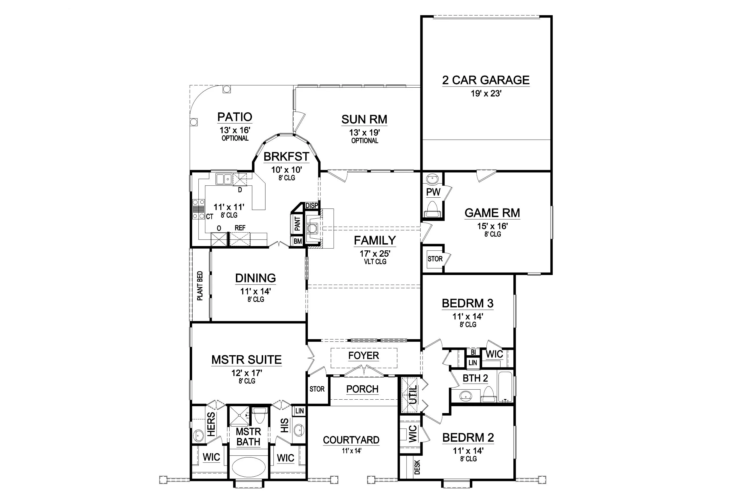 This custom Mediterranean stucco house plan offers plenty of room on one level. From the front courtyard, enter the porch into the open foyer. Two family bedrooms with walk-in closets share a Jack and Jill bath, with a utility room in-between. Across the foyer is the luxurious master suite with his and hers vanities, separate shower, tub and his and hers walk-in closets. The family room is centrally-located to the game room, two-car garage, sun room, breakfast area and dining room. Treat yourself to a gourmet kitchen that you'll love cooking and entertaining in. The windows along the back of the house allow plenty of sunlight into this custom Mediterranean stucco house plan.