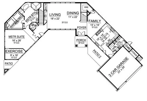 In this contemporary luxury house plan, warmth and beauty will surround you. The stunning two-story entry opens into the large living room with warming fireplace and built-ins, and the dining room with two story windows that allow the bright, natural light in. The wine room off the family room offers an area to store all those great vintages. The kitchen has a free-standing island and eating bar, a built-in hutch for grandma's special dishes and plenty of counter space. Enjoy that morning coffee on the kitchen's attached patio. The left wing houses the large master suite with exercise room, a lavish bath with his and hers sinks, separate shower and tub, a large wardrobe and cedar closet. Upstairs, two family bedrooms with large walk-in closets and full baths share space with the large office/study that includes a full bath and bar. Enjoy the views to the main level below. Take a long look at this luxury house plan.