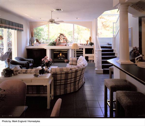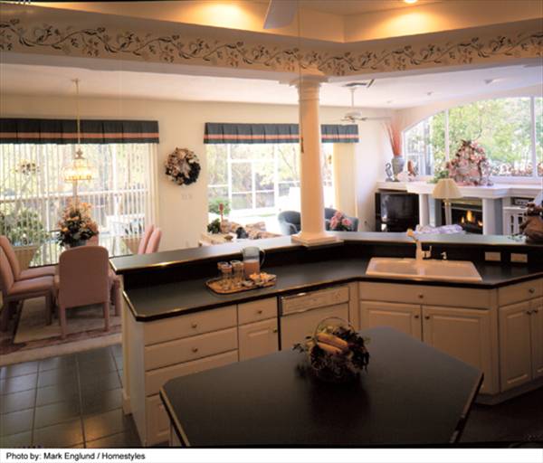 The family room can be incorporated into entertainment plans for feeding large groups or opening the interior to the rear patio and pool with the sliding glass door wall.