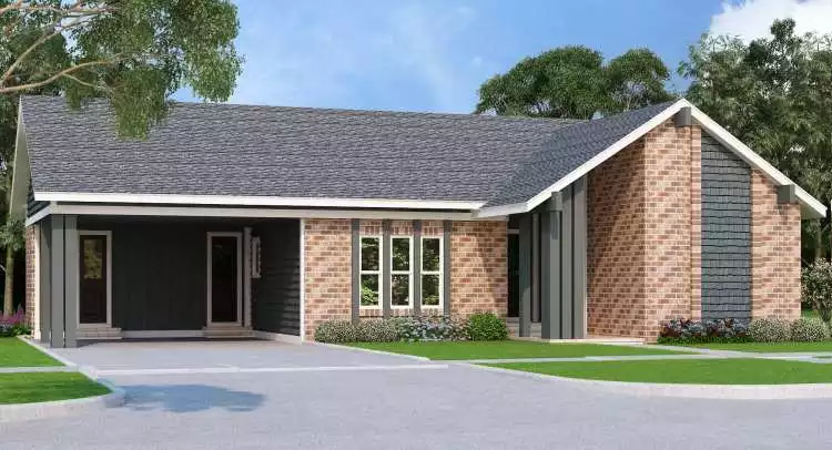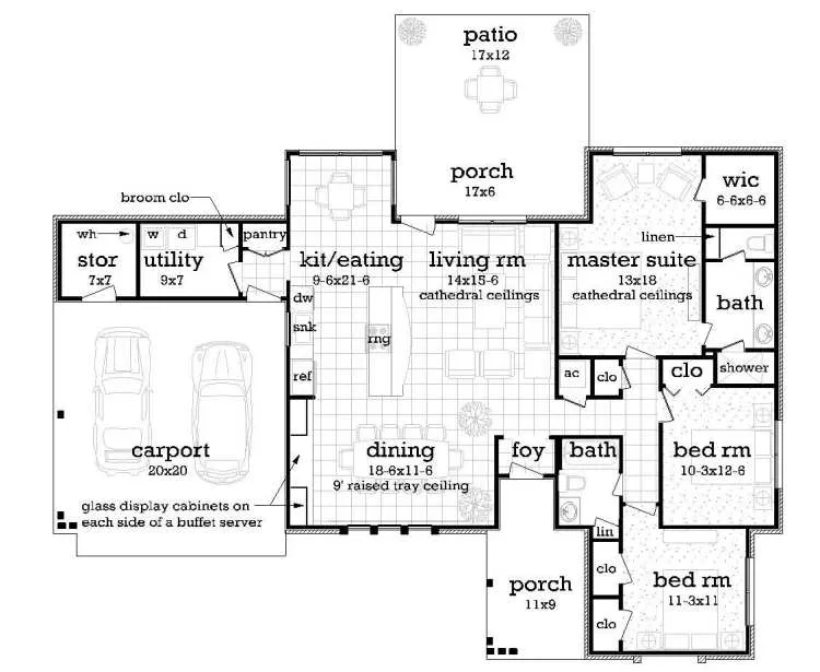 Sturdy brick enhances this affordable ranch-style house plan, with three bedrooms, two baths and 1,550 square feet of living space. The central living room is the main gathering place for this home plan, topped by a cathedral ceiling. Expand any party to the rear porch and patio. The wide-open kitchen with curved island serves the bright eating nook and the classic dining room with grace. Glass display cabinets and a buffet server add interest. A cathedral ceiling presides over the master bedroom in this home design, which boasts a walk-in closet. The personal bath includes a seated shower and two sinks. Our customers love the breezy carport with storage room.