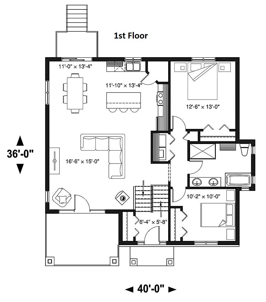 Great country rustic split level 1,272 square foot, with large front covered balcony off the living room. The split entrance offers a wardrobe and is slightly set back from the living room, keeping the cold / hot away from the common areas, convenient during our winters / hot summers! The lounge area (living room) and the dining room are in open concept and share the heat of a wood stove fireplace located near the access to the front covered balcony. The dining room offers a convenient patio door leading to the backyard. Moreover, the dining room is also open to the kitchen allowing a good circulation and communication between the occupants and the cook! The kitchen has a walk-in pantry as well as a good size island which can comfortably accommodate 3 guests.  The master bedroom and one secondary bedroom are located immediately next to the full family bathroom, on the main floor, but away from the family area. The family bathroom suggests a very convenient layout with large shower and separate bath tub, toilet, dual vanities and a linen closet.  Future bedrooms and a shower room are provided in the basement, but can have different vocations such as a home office, a family room or simply a guest bedroom. You decide! We thought of an efficient basement layout for the future. The suggestion is included in the plan that you will receive but is not taken into account in the construction costs proposed on our site. You have the choice to decide to finish your basement or not.  Please note that many foundation options are available for our plans, contact us for more details.