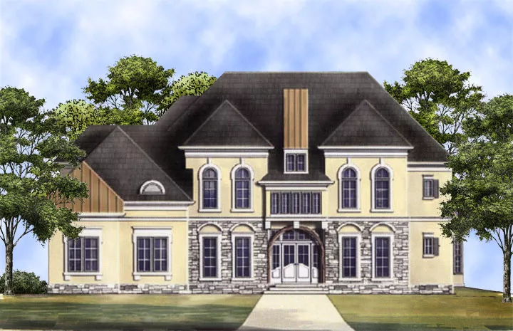 Keystone arches and a pedimented entry grace the facade of this luxury home. The grand salon, a family room, the dining hall and a library revolve around a central foyer with curved stair. An island gourmet kitchen is open to the family room and a sunny morning room. The master suite is conveniently placed on the first floor and features a bath with spa tub, separate shower and two vanities. The second level holds three bedrooms with walk-in closets and private baths, plus a bonus room that can be developed later.