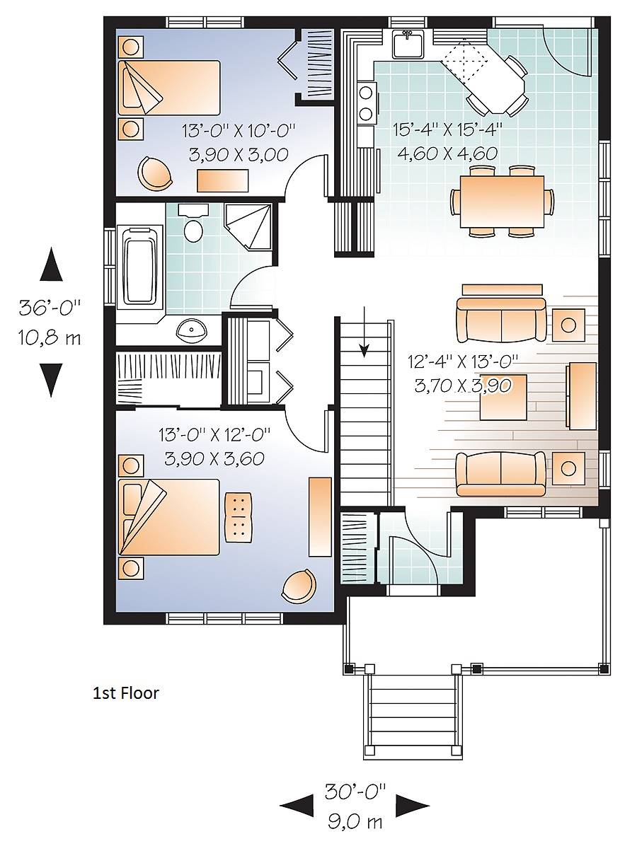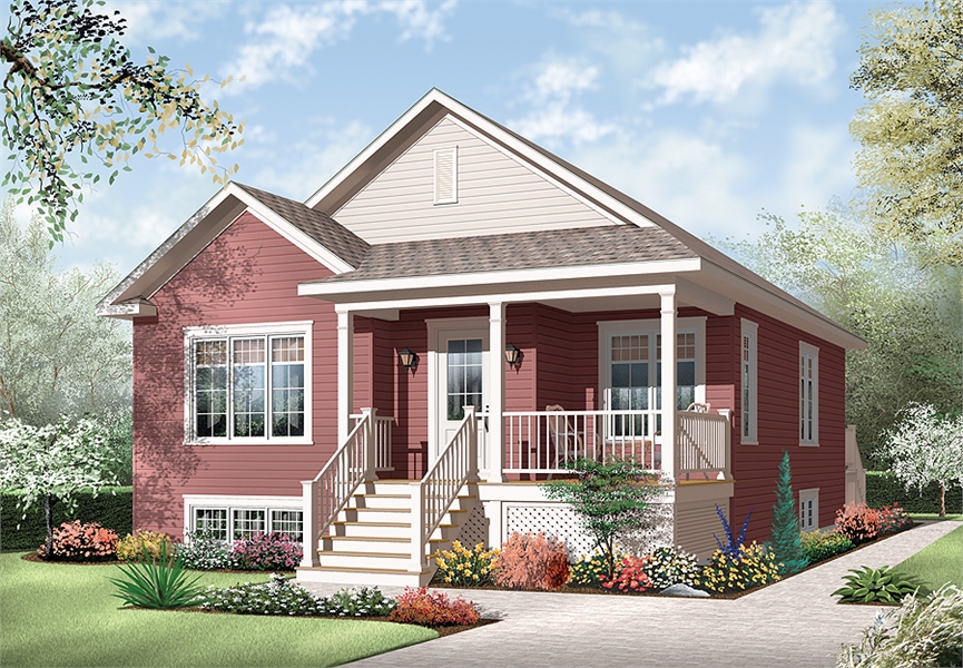 This 1,070 square foot bungalow with eco-appeal is economical and ecological, following the trend of efficient, and affordable homes. A deep gable facade gives an undeniable visual impact. Read or visit on the charming L-shaped porch or merely enjoy the shelter from the elements as you enter.  Inside, a vestibule opens onto an entirely open and bright activities area. A pair of garden doors brings in backyard views.  Two bedrooms share a bathroom with garden tub and independent corner shower, plus a washer / dryer area overlooks the small corridor adjacent to the bathroom. Need more space, an unfinished basement has further potential for storage or other development.