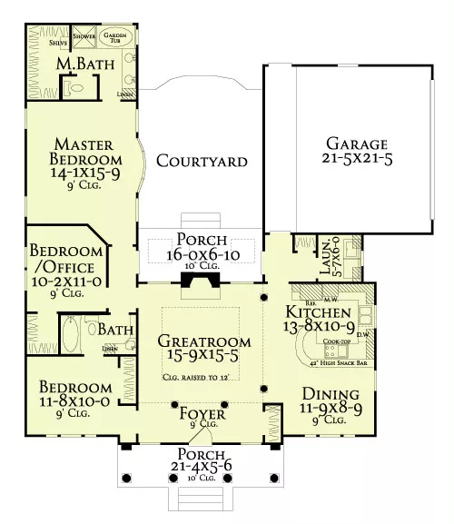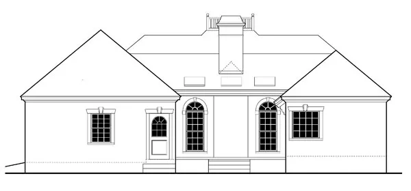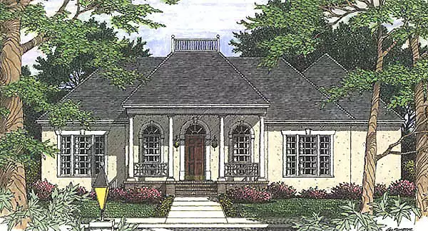 This classical, raised porch intrigues with architectural columns, wrought iron railing and arched windows. The vaulted living room looks onto the skylit porch and courtyard. The master suite presents an attractive window setting with view into the courtyard.