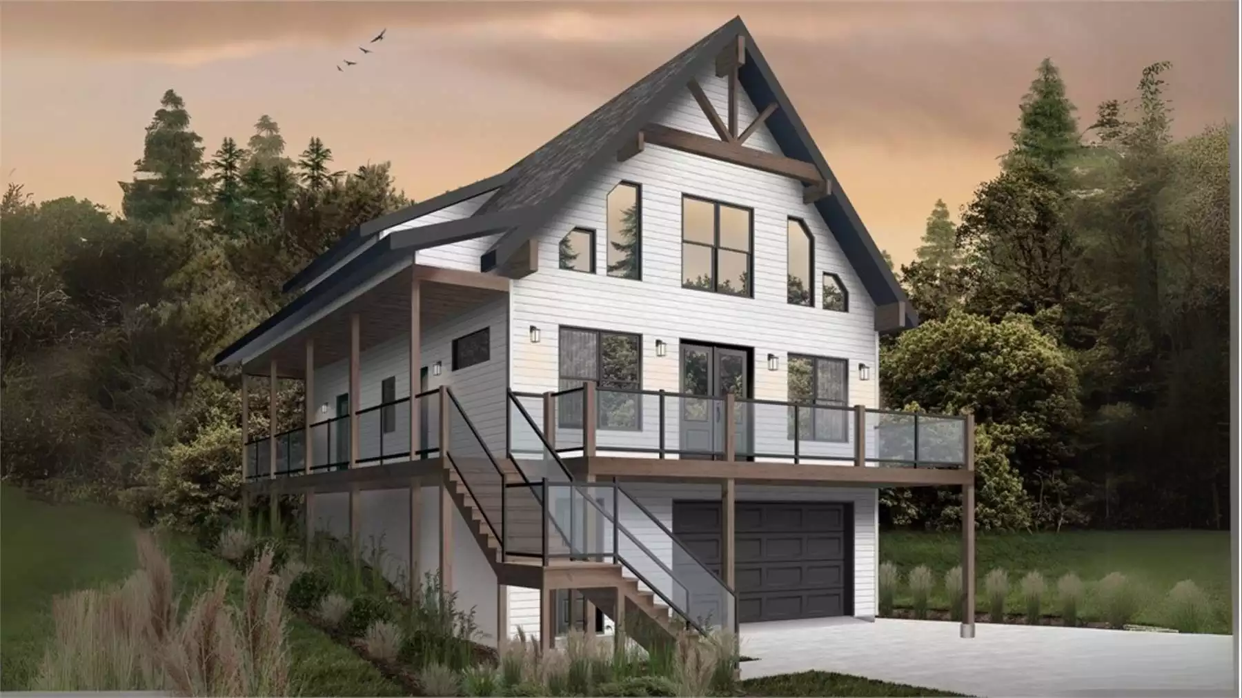 This beautiful 2-story rustic mountain lake house plan is perfect for a sloping lot with a drive-under garage and 2,055 square feet of living space. There are 4 bedrooms, including a master bedroom with private ensuite on the main floor and a small guest bedroom. Upstairs is a large flexible space for a game room or loft and 2 full bedrooms. The living room, dining room, and L-shaped kitchen with island seating share an open space with cathedral ceilings and the warmth of a wood burning stove.