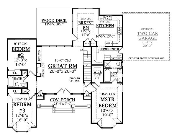 This craftsman styled larger variation of our most popular plan no. 2808 is just about perfect. The split bedroom plan assures privacy. The light filled central great room with a dramatic 10 ft. high ceiling is the home's focal point. Note the convenient Home Center off the kitchen with ample space for the home computer as well as laundry folding area. For photos of the smaller plan see plan # 1877.