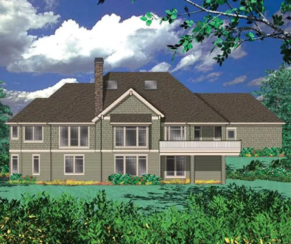This plan is designed for down sloping lots. Taking a twist on Craftsman detailing, this hillside home is perfect for lots that slope to the back. Stone accents on the facade complement cedar shingle siding; a double door entry features a transom window above.