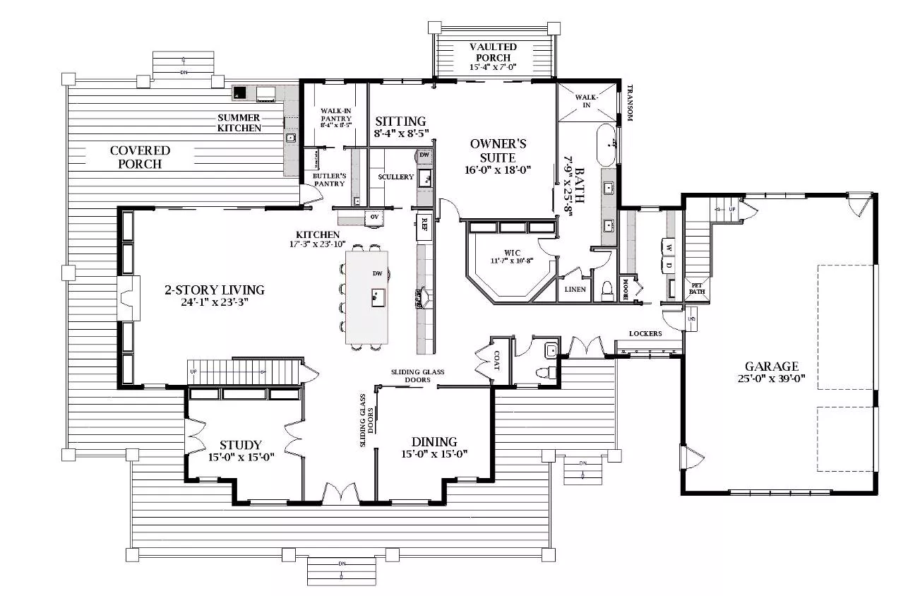 The back right of the home is a luxurious suite for the owners of the home. From the private covered vaulted porch off the sliding glass doors to the sitting room, perfect for late night reading or morning coffee, rest and relaxation is already apart of the plan. The huge bathroom has a stand alone bathtub accentuated by transom windows, a walk-in shower, a closet with built-ins and dual sinks.