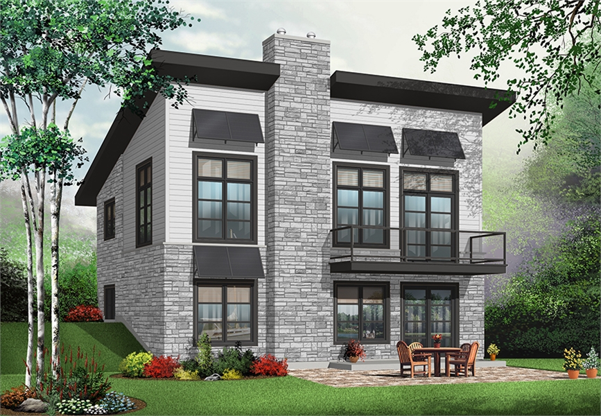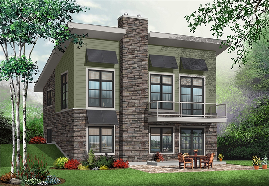 The contemporary feel of this modern style house plan provides all of the feelings and accommodations of city living, without any of the hassle. With the trendy look of a town home or metropolitan building, this 1,759 square foot home offers 3 bedrooms and 2 bathrooms of high-end living. The layout of this plan is conducive to family living. With a basement level that is home to 2 bedrooms and a sitting area, and a main floor that has a sizeable living room and kitchen. The main floor even offers a balcony area and a patio sitting space below. Both floors have a large bath tub and shower area in their bathrooms for easily accessible comfort