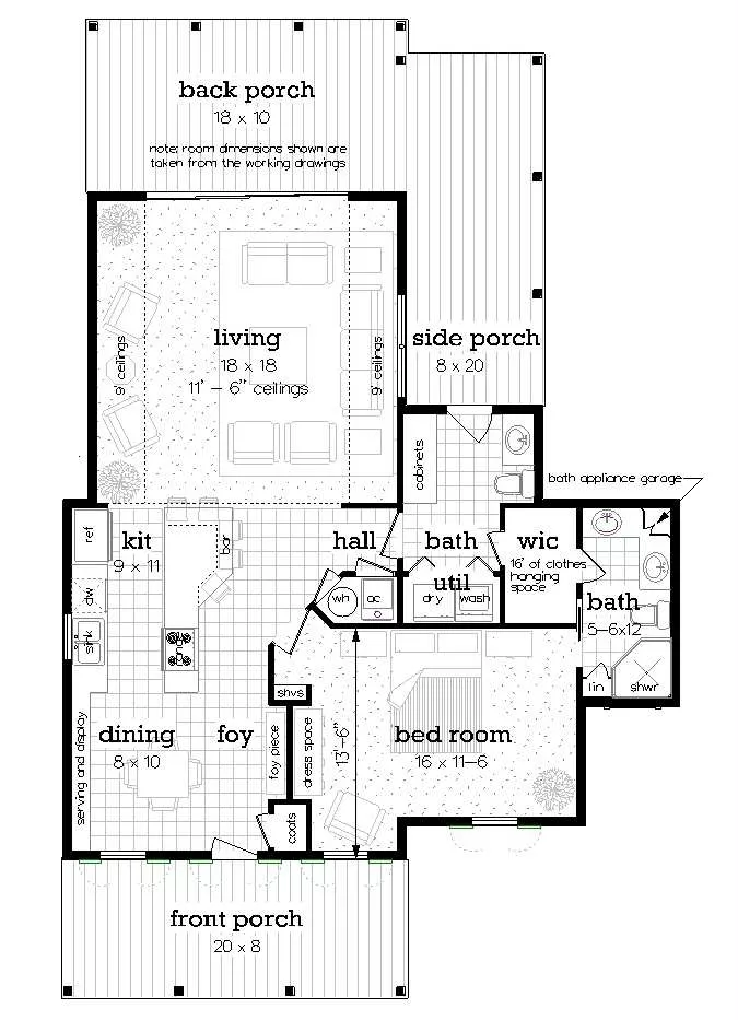 Beautifully charming and absolutely affordable, this single-story cottage is a great plan for so many uses. Perfect for a starter home, a vacation spot, or even those looking to simplify and downsize, this 1 bed 1.5 bath plan has all of the necessities. An upgrade to our popular THD-5289 design, this home has 1,062 square feet of totally open space. Beginning with your welcoming front porch, encased in ornate woodworking and details, move inside to discover a fully inclusive area. From the kitchen and dining nook, beyond to the massive living room and wrap around back deck, this home has so many possibilities. And at the end of the day, kick back and relax in your oversized master suite with a full bath and large walk-in closet with tons of storage. So convenient!
