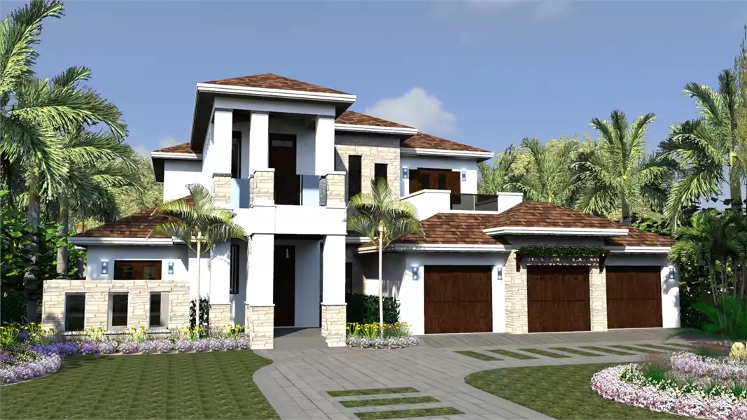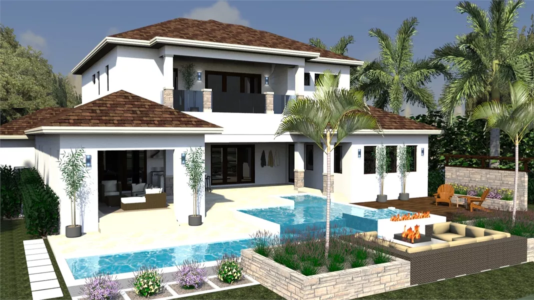 Hipped rooflines and stone accents embellish this luxury Mediterranean-style house plan, with 4,177 square feet of living area, plus four bedrooms, four full baths and two half-baths. A fireplace warms the enormous great room in this home plan, where sliding glass doors access a covered lanai. You'll love the open kitchen, which showcases a useful island with snack space, in addition to a refreshing wet bar and a handy pantry just steps away. The sizable dining room is perfect for special meals or everyday suppers. Add cool breezes to any meal by using the summer kitchen to serve lunch on the lanai. The optional pool area is magnificent. The deluxe master bedroom opens directly to the breezy lanai. The personal bath hosts a garden tub, a huge shower and two sinks. Don't overlook the two walk-in closets. Three guest suites on the upper floor of this home design contain their own baths and walk-in closets, plus outdoor access. The special lounge could host card games or conversation. Our customers love the main-floor study, which would make a nice home office.