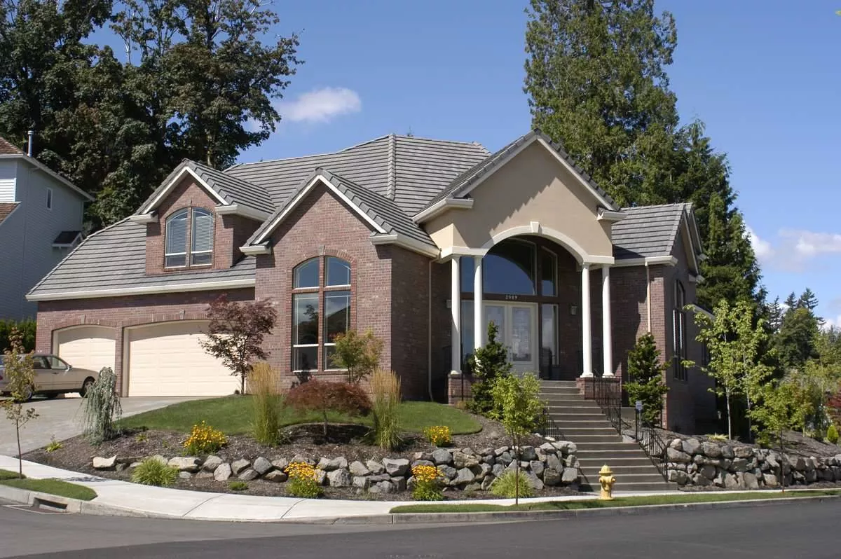 The home's upper level hosts a master suite, three additional bedrooms, a compartmentalized bath, and a play room. Double doors open the master bedroom with its high, decorative ceiling. The attached bath features two vanities, a walk-in shower, and a whirlpool tub.