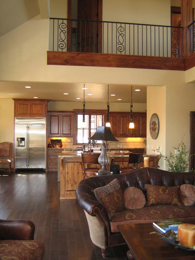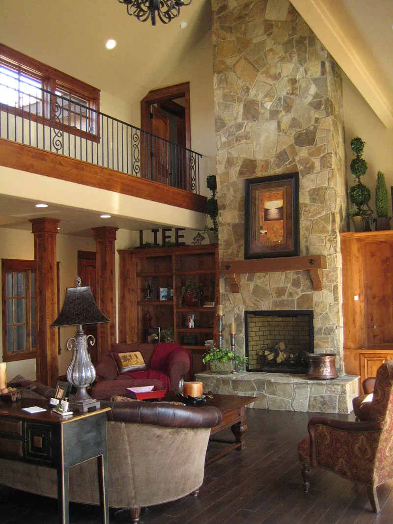 As you pass through the stone pillars and through the covered entryway the first thing you will see is the great room with a dramatic fireplace flanked by built-in cabinets. An eating bar separates the great room from the island kitchen and dining area.