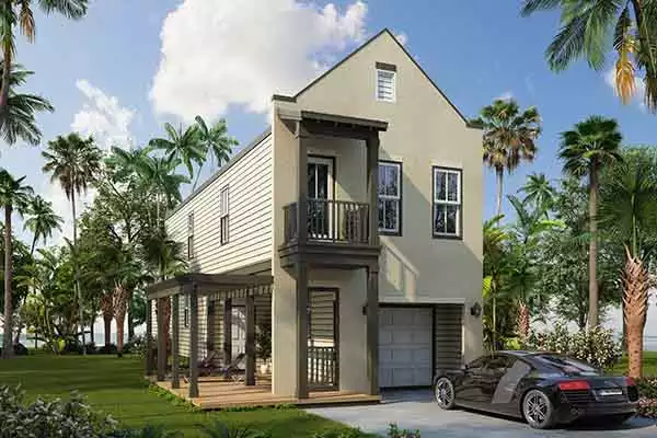 Homes that surround the marinas where manatees congregate in the brackish rivers in Florida would be a picturesque setting for this model plan. The 3 bedroom design is very popular in wide variety of communities in the South and Caribbean. It is designed for a narrow lot site, just 25' wide would be ideal. (Since the front door to the house is set well back from the wall of the house a sheltered patio is created for outdoor entertainment.) A one-car garage is recessed front the front face of a plain flat stucco profile with a small balcony that projects from the master bedroom on the second floor. There is a very open first floor living area with a vaulted family room. It adds up to a home with very contemporary features for a very tiny site.