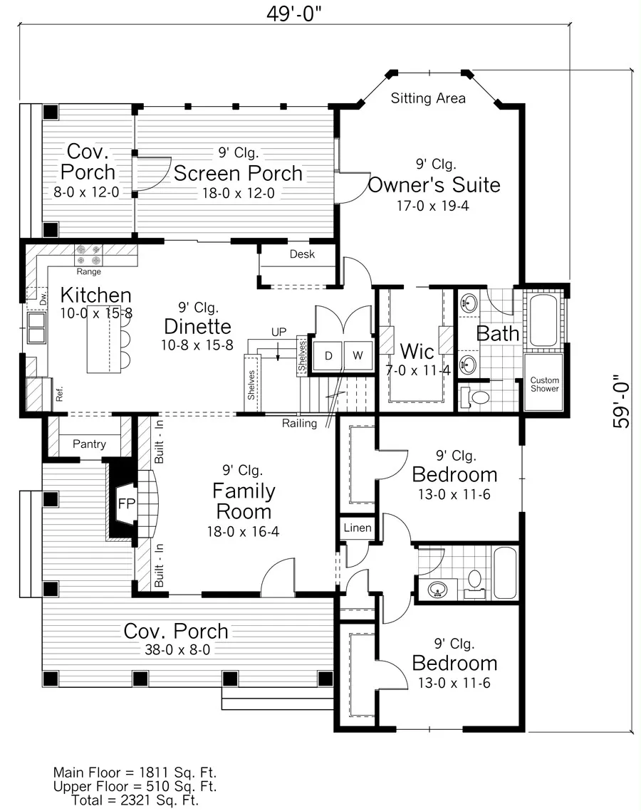 A wraparound front porch lends a country feel to this affordable house plan, with three bedrooms, two baths and 1,811 square feet on the main floor. A family room is the main gathering place in this home plan, warmed by a fireplace. The wide-open kitchen boasts a useful island and a handy pantry. Serve meals at the snack bar or in the versatile dinette. To take advantage of fresh air, consider eating dinner on the screen porch. At the end of a busy day, retire to the posh owner's suite, complete with a bayed sitting area. Don't overlook the walk-in closet. A garden tub anchors the private bath, along with a custom shower and a dual-sink vanity. A second full bath serves the two children's bedrooms in this home design, each with a walk-in closet. Our customers love the upstairs loft. A quiet bonus room could serve as an exercise area.
