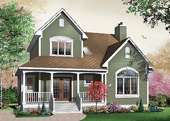 A wraparound front porch gives this two-story farmhouse plan a nostalgic feel. Two French doors introduce the spacious foyer, with its sizable coat closet. The living room is enhanced by a lovely window arrangement. The modern kitchen serves the versatile dining area quite tastefully. A quiet office could function as a guest room. Upstairs, three bedrooms share a well-appointed bath.