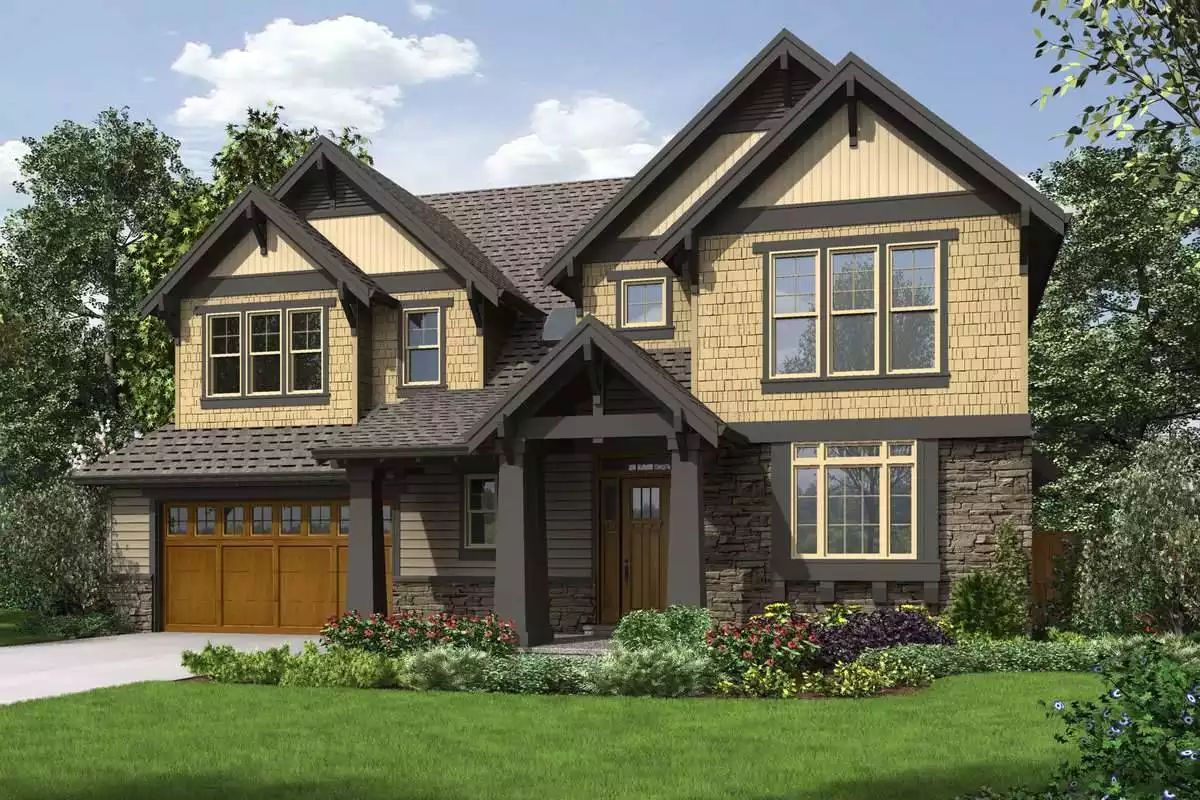 Classic elements meet sensible designs in this prime example of a gorgeous craftsman style house plan. Offering 3,202 square feet, this 3 bedroom, 2.5 bathroom home provides 2 stories of living space. The exterior is adorned in a beautiful combination of traditional shake siding and a modern twist of stone footing. Elegant windows around the home provide a highly aesthetic atmosphere. The main floor offers plentiful space and storage, as is seen with the dedicated shop space which is attached to the 2-car garage. Beautiful built-ins can be seen in the office area as well as the media center of the great room. Directly off of the kitchen, the dining room opens to a sizeable covered patio and outdoor area. The second floor is home to all of the bedrooms, including the master suite, highlighted by a spa and his and hers separate walk-in closets, a true rarity. In addition to the bedrooms, the second floor has a game room, sure to be a hit with friends and family alike.