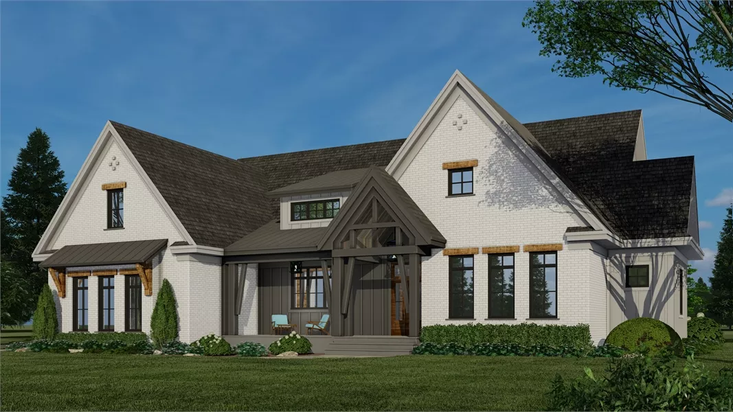 This one-story 2,336 square foot modern farmhouse plan features family style bedrooms that occupy the right wing with a centrally located laundry room. The L-shaped kitchen overlooks the front covered porch and is open to the dining area and great room which shares a double-sided fireplace with the 15’ x 17’ covered porch. Multiple garage designs are available for a  2 or 3-car garage front or side entry, and include a bonus space above.
