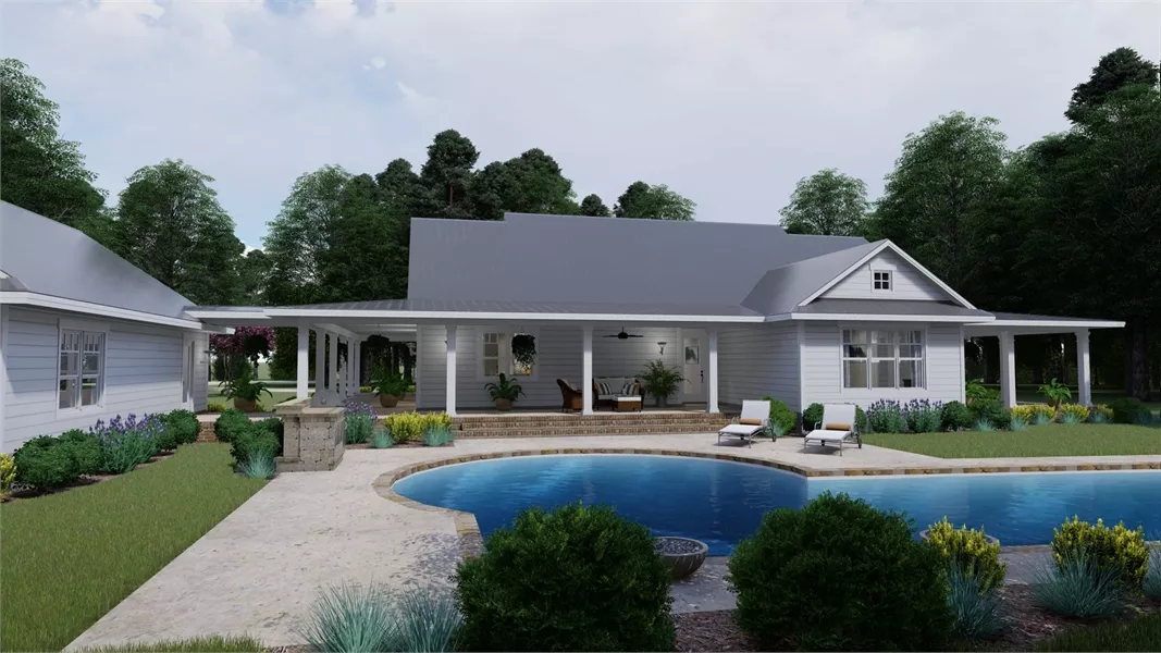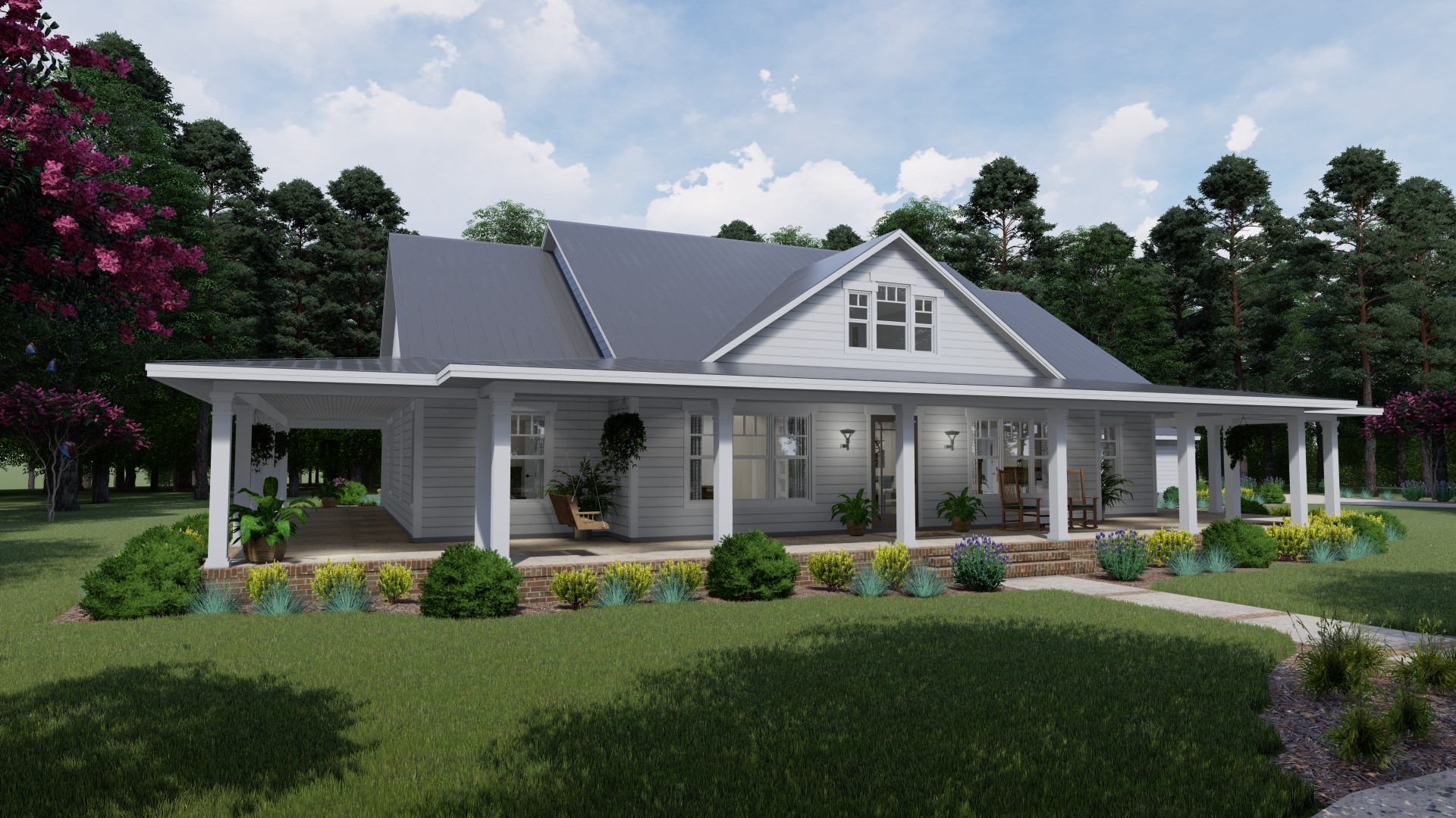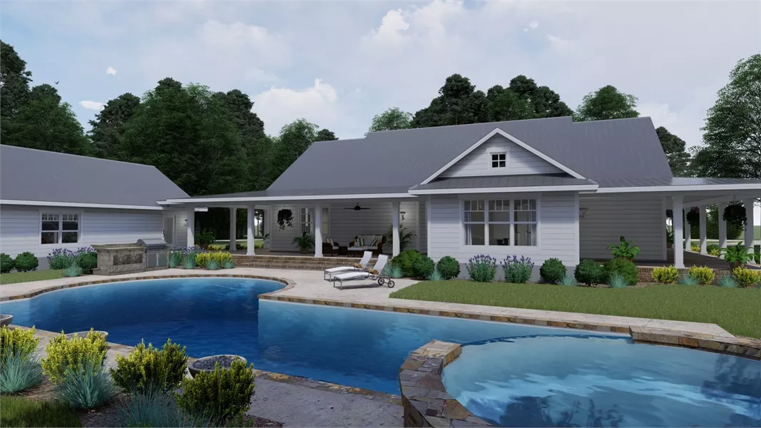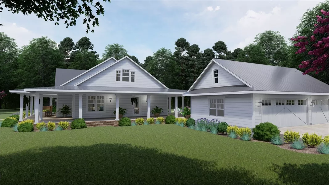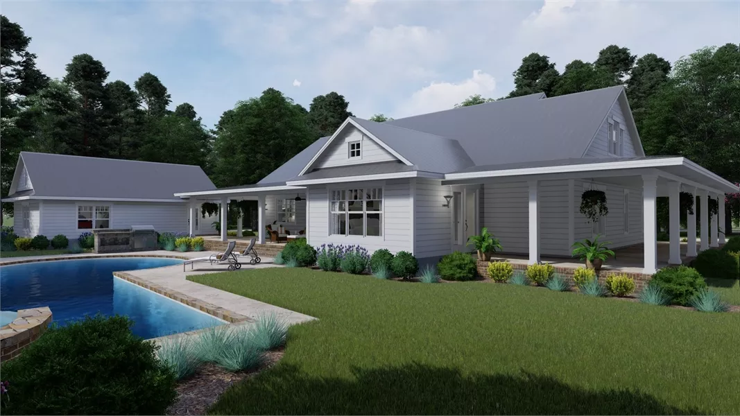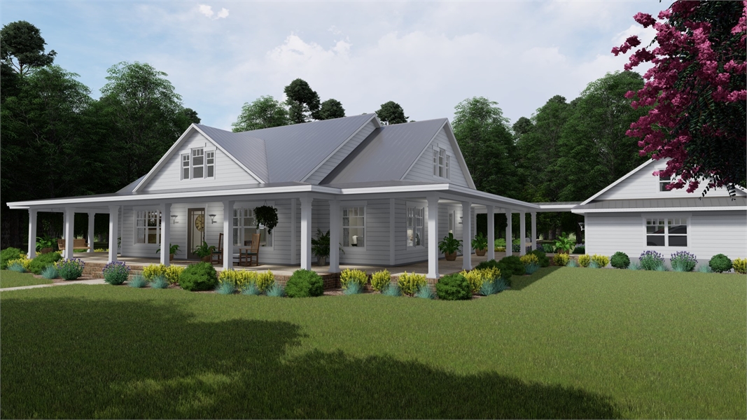 This country three-bedroom house plan with veranda is both charming and comfortable. You'll love the thoughtful layout of this home plan, with a total of 2,748 square feet on the main floor. The living and dining rooms are perfect for entertaining, warmed by a modern fireplace. The country kitchen includes a handy pantry. Note the convenient location of the utility room. The quiet master suite offers a private bath with a garden tub. Double doors give veranda access. Two more bedrooms share a hall bath. One bedroom could serve as a study or home office. Upstairs, a large bonus suite would be great for a returning child.