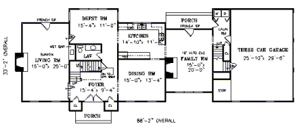 This center hall two story can be built with multiple front choices as seen in the photos. It also features a dramatic interior. A distinctive feature is the separate guest bedroom and loft located above the three-car garage, and overlooking the family room. Fireplaces grace both the family room and the sunken living room on the opposite end of the home. A large breakfast room and dining room border the kitchen for informal and formal occasions. A tray ceiling is featured in the lavish master bedroom, which features an adjoining sitting room and a walk-in closet. The master bath boasts a skylighted tub and a separate shower. The home may be built with or without a front porch. The blueprints show both versions.