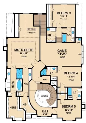 You will feel right at home when you enter this stunning Tuscan style home. In the two story foyer, your eyes are immediately drawn to the spiral staircase. The foyer is flanked by the spacious living room and study. Beyond the foyer through a barrel vaulted area, an elevator is an alternate way to get to the second floor. The elegant dining room offers a coffered ceiling and access to the butlery and kitchen for ease in serving. A main-floor bedroom includes a full bath. The large family room with fireplace will keep the attached kitchen and breakfast areas cozy. The island kitchen offers a curved breakfast bar. A pantry, window seat and desk define the breakfast area. Adjacent to the family room is a bar, plus private access to a sheltered patio. Upstairs, three family bedrooms boast direct access to full baths. A game room with bar, and a loft share the rest of the second floor with the luxurious master suite. A large sitting area with vaulted ceiling offers views of the rear yard. The master suite boasts his and hers bathrooms and separate wardrobes.