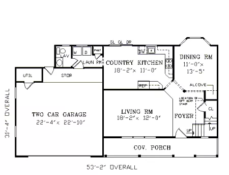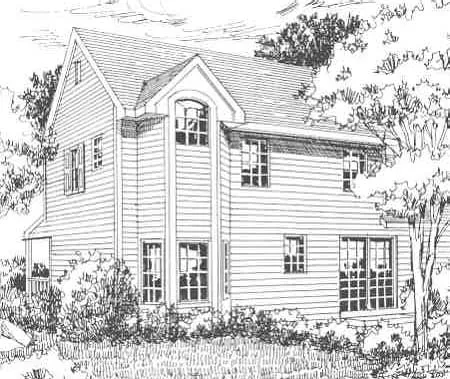 Easy, affordable living is the basis for this great town and country design. I created the welcoming porch and the graceful arched window to give the home its curb appeal. Inside, the floor plan provides large, highly livable spaces rather than several specialized rooms. The foyer opens to the spacious living room. A column separates the foyer from the formal dining room, which features a bay window and an alcove that is perfect for a china hutch. The country kitchen is large enough to accommodate family and guests alike. A beautiful open staircase leads to the second floor, where there are three bedrooms and two baths. The master bedroom offers a tray ceiling and a luxurious bath with a sloped ceiling and a corner shower.