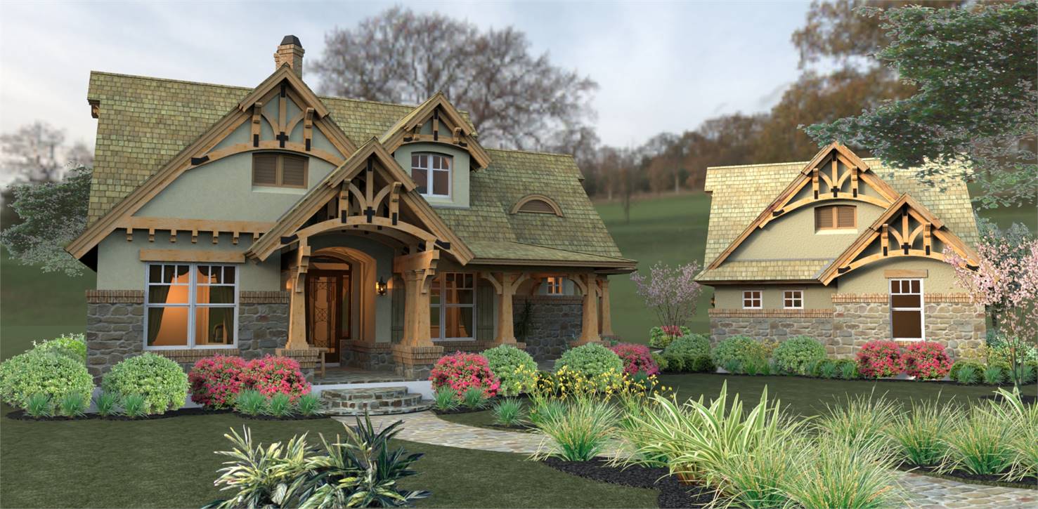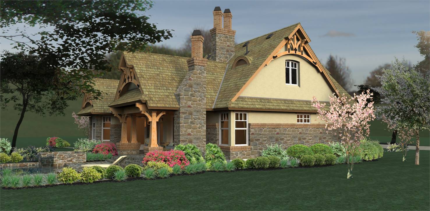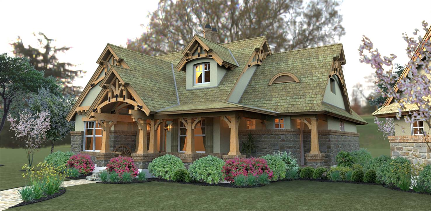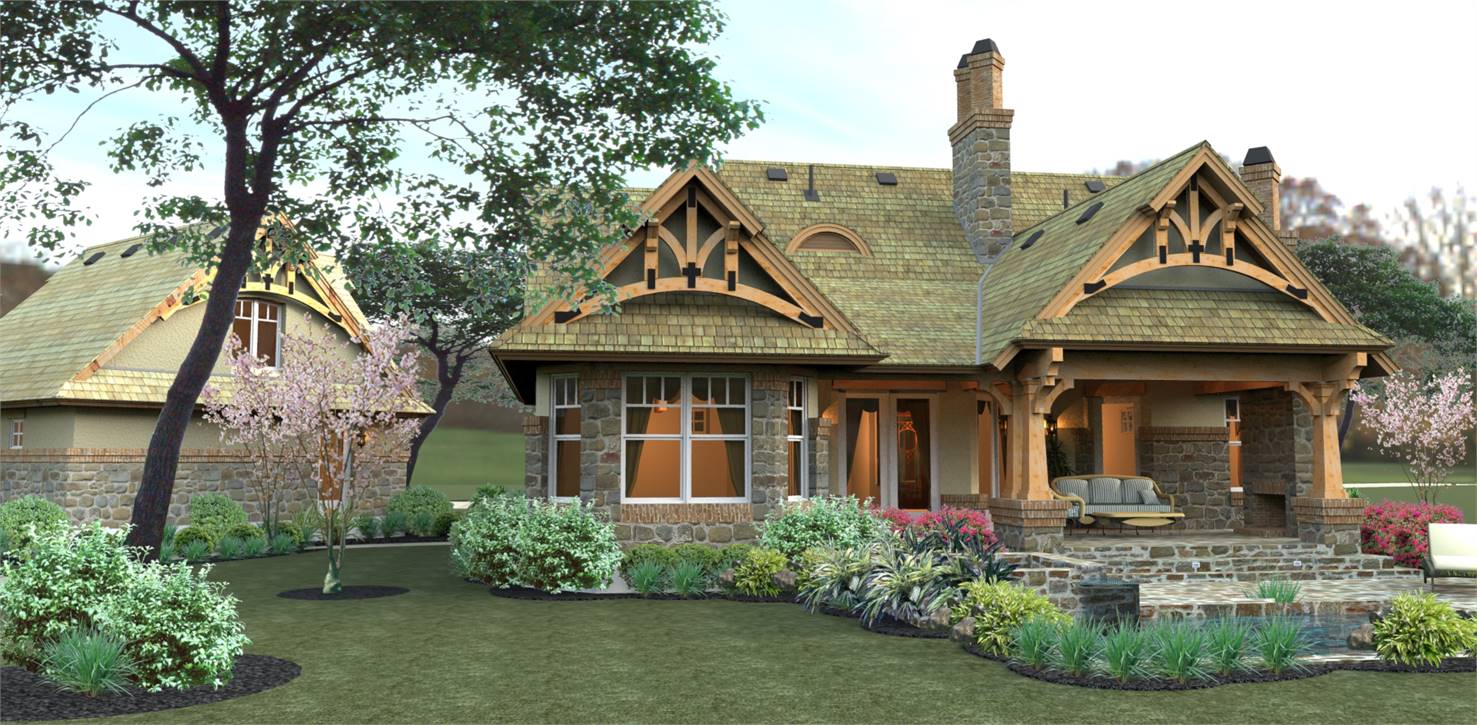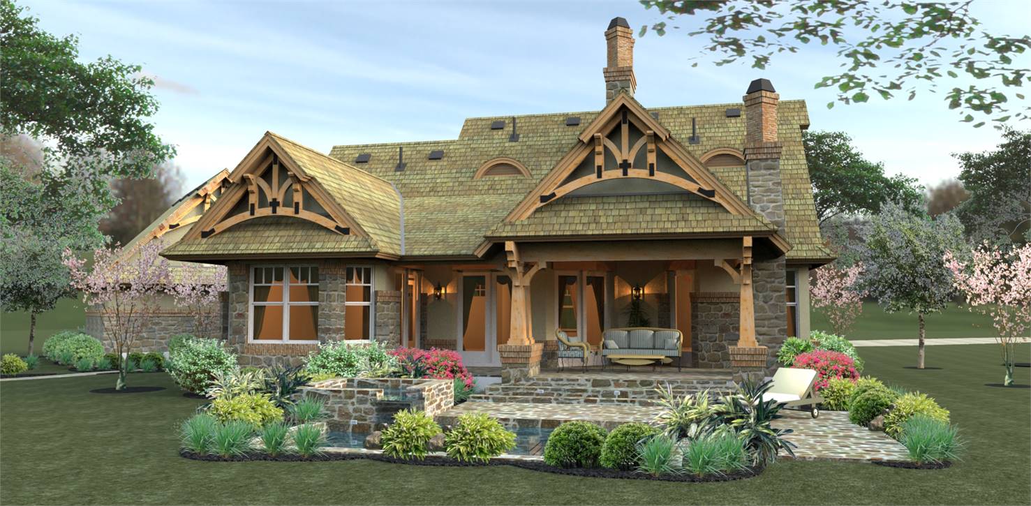 House plans with only 1,421 square feet don't normally showcase this many features! Part of this home's popularity is the fairytale front porch with all the charming Craftsman details. The kitchen island is perfectly located to open up to the family room where a fireplace is the center of family gatherings.  To the rear of this beautiful home, French doors open to a lovely lanai with a second, optional outdoor fireplace. The master suite offers gorgeous windows and access to the lanai. Upstairs, a good-sized bonus area can become another bedroom, a home office, home theater or whatever fits your needs.  Since it's been released, THD-2259 has become one of our customers and builder's favorite small home plan