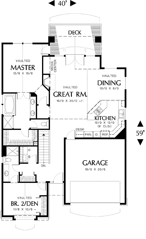 The main level also houses a lavish master suite with a walk-in closet and a bath with both a tub and shower and a private toilet compartment. At the front of the house, a den features a bumped-out window and vaulted ceiling. An adjacent bath makes it convenient to use the den as a bedroom.