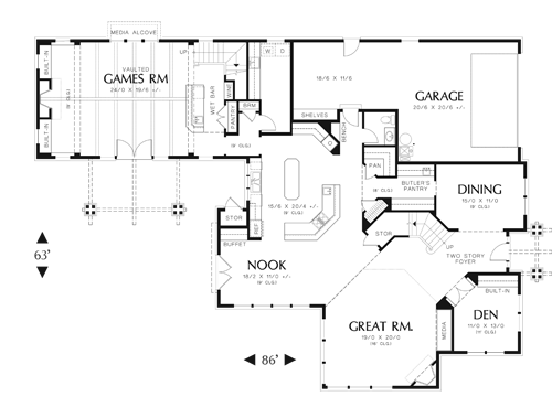 At the back of the plan, the games room is vaulted and features double doors to a patio, a media alcove and a fireplace with flanking built-in cabinets. A wet bar nearby allows easy entertaining.