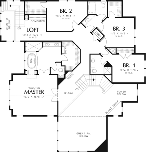 Four bedrooms upstairs include a master suite with a vaulted salon and spa bath, and Bedroom 4 with its own bath. A loft near the rear staircase offers space for a computer station.