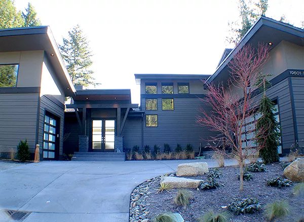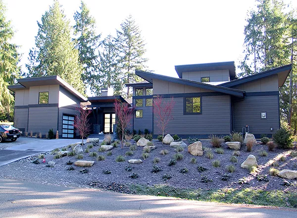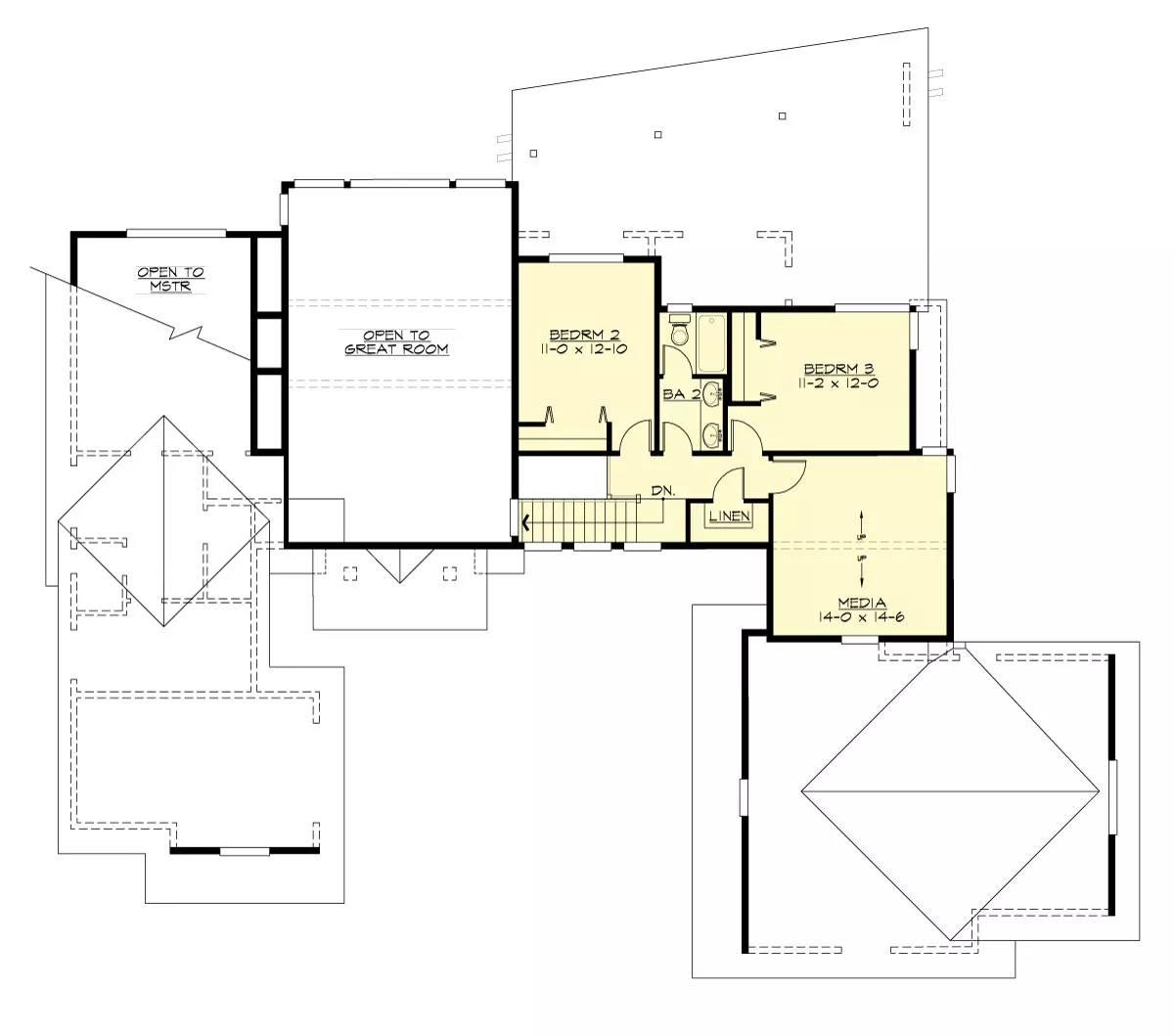 Interesting angles and windows add to the curb appeal of this contemporary house plan, with three bedrooms, three baths and 2,829 square feet of living space. A high ceiling and a crackling fireplace are highlights of the spacious great room in this home plan, which hosts any gathering in comfort. The open kitchen allows you to have meals at the island snack bar or the sizable dining area. Note the nearby pantry. When weather permits, serve dinner on the covered patio of this home design. Unwind in the posh master bedroom at the end of a busy day. The private bath showcases a garden tub, a separate shower, two sinks and a walk-in closet. Upstairs, two secondary bedrooms share a compartmentalized bath. Our customers love the versatile media room. The quiet study would make a nice home office.