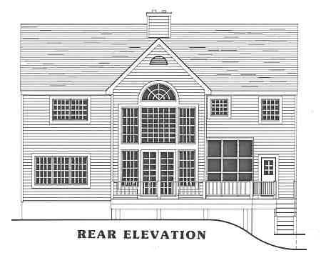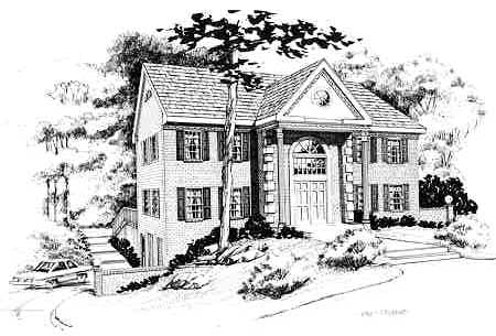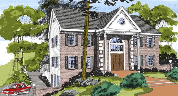 This elegant colonial is adorned with stately columns and a brick front. Entry is into a dramatic two story foyer with a breathtaking view into the rear family/great room. The stunning two-story-high great room features a cozy fireplace and a gorgeous window wall surrounding French doors that lead to a rear deck. The luxurious first floor master suite includes two closets and a private bath with double sinks, a tub and a separate shower. The second floor features 3 bedrooms and a rec room, which could become a fifth bedroom if desired. The plans includes a two car garage in the basement, which would be suited for a side sloping lot. However the home cpould also be built with a detached garage, or even a setback attached garage on the kitchen side.