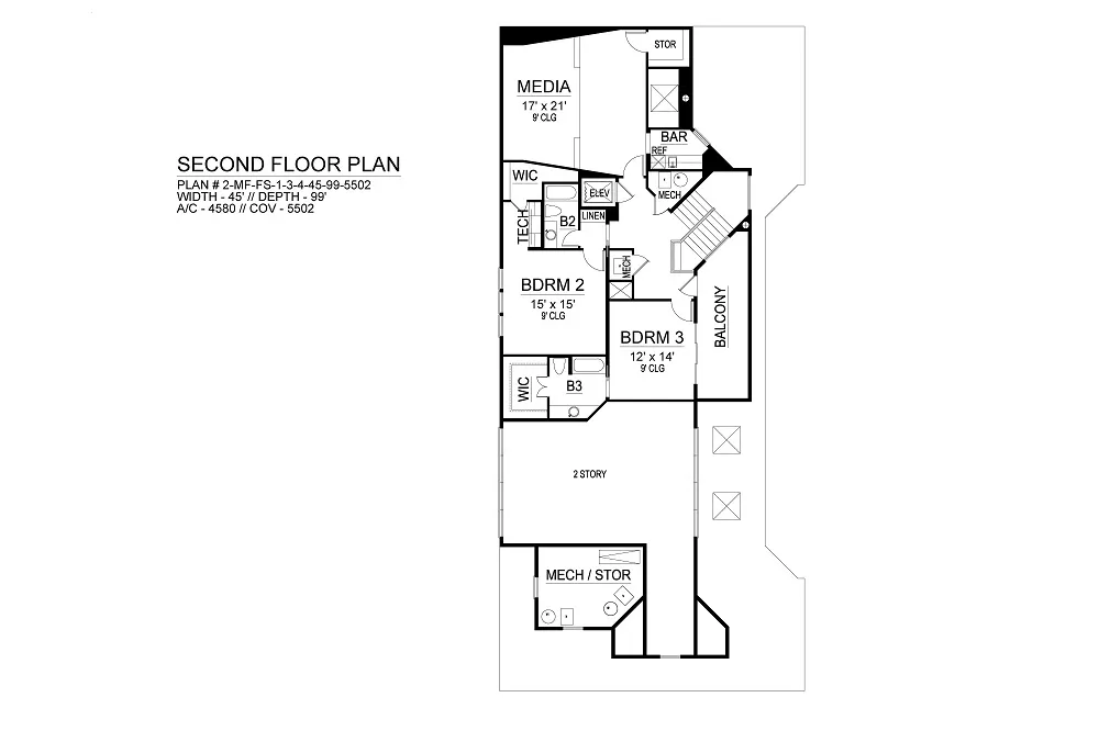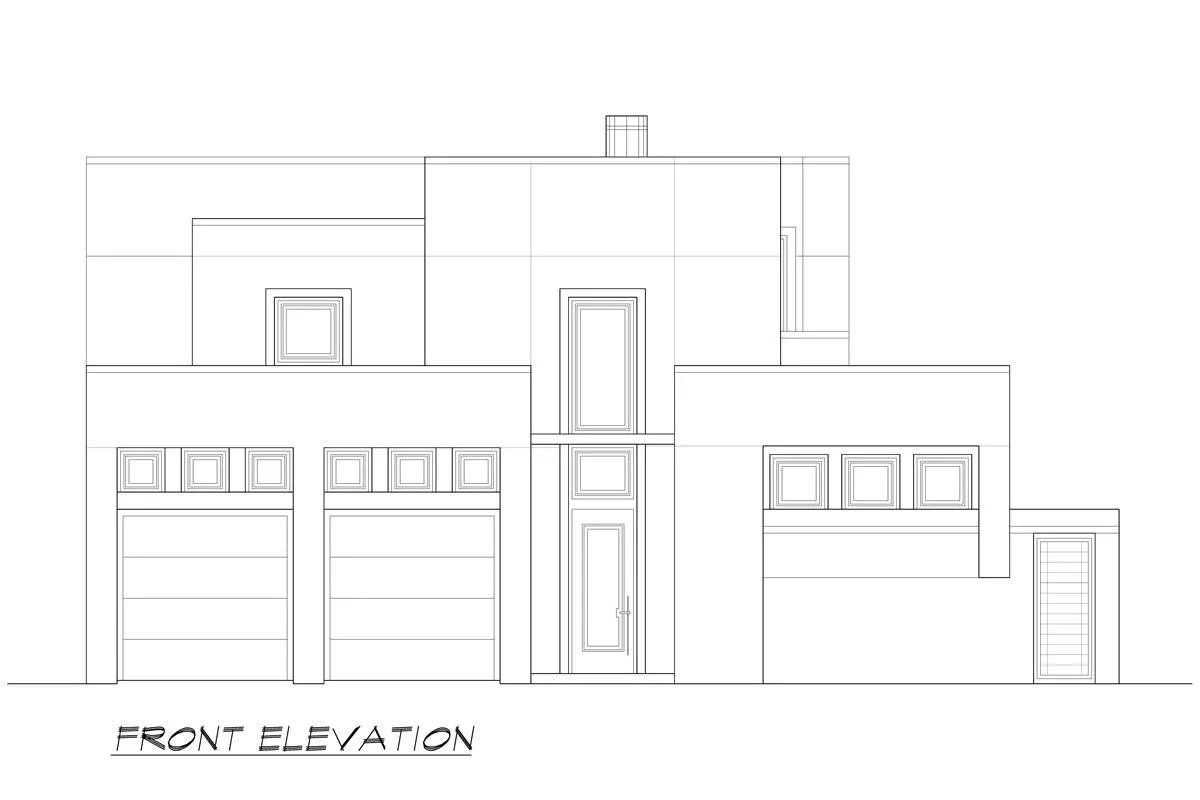 If you are looking for a modern contemporary house plan, you need to look at this extraordinary architectural design with modern upgrades that are incomparable. Designed for a narrow lot line, no grand scheme is lost within. Clean straight lines flow from the exterior inward, with square windows and rectangular windows. Two windows above the front door stretch to the second story and welcome you inside. A large quiet study with access to the veranda, walk-in closet, and full bathroom could double as a guest room or fourth bedroom. Directly ahead of the foyer is the two- story formal living room with a floor-to-ceiling walls of windows on one side and doors to the veranda on the other, offering sunlight to stream in on both sides. An open design and state-of- the-art appliances prove a winning combination in this gourmet working space that seamlessly integrate the gourmet kitchen with the breakfast, dining and living rooms. The kitchen offers granite countertops and a disappearing backsplash between the cooktop on the eating bar and the eating bar itself. Recessed lighting, sleek lines, well-lit countertops, two dishwashers, and windows above cupboards in the kitchen deliver a modern feel. A utility room adjacent to the kitchen is large enough for a freezer, washer, dryer, laundry tub, and folding area. A large pantry in this area benefits preparing and serving meals in the gourmet kitchen or the elegant dining room. The veranda offers a cooking area with grill and a sauna, and this outdoor space accommodates both casual mealtimes and intimate conversations. Natural flow to and from the dining room and easy access to the backyard make this the perfect perch for guests. The luxurious master suite faces the rear and boasts a two-way fireplace and luxurious master bathroom with his and hers vanities, glass shower with multiple shower heads, center step-up tile Jett tub next to the fireplace and television, two linen closets, a large wardrobe with built-ins, and an exercise room. An elevator outside the master suite leads to the second floor where two family bedrooms with walk-in closets and full baths share space with a media room with bar and storage and two mechanical rooms. One bedroom has a tech area while the other has a large private balcony. Stairs between the bedrooms and media room can also be accessed to move between the two floors. An exterior storage area at the front of the home can be used to store gardening tools and completes this extraordinary luxury contemporary house plan.