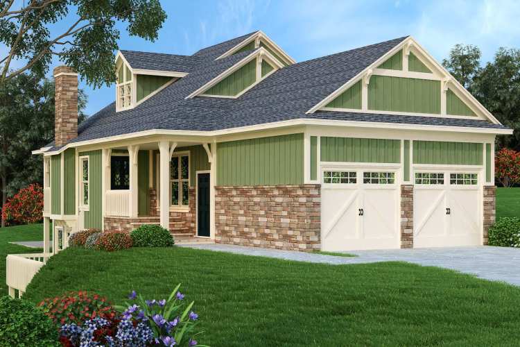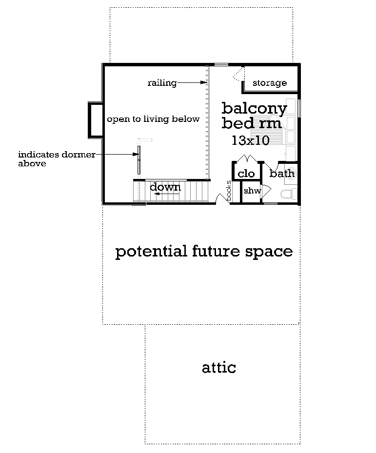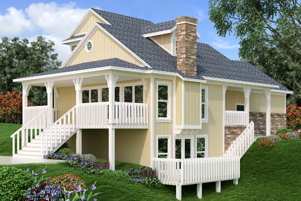 Designed especially for a hillside or mountainside location, this cozy cottage is ideal for a mountain retreat. The interior is bright and airy with lots of rear and side oriented glass and a soaring living room ceiling with dormer windows open to the living room. The living space has direct access to a large covered rear porch for sitting and taking in the views. The kitchen is compact but it is fully appointed, conveniently located and so very functional. The utility closet and half bath are also well positioned for convenience. The master suite has a large glass wall for open views and plenty of light. The master bath is full sized and contains a unique bath appliance garage plus there is a huge walk-in closet too. The upstairs balcony bedroom is ideal for a kids space and it has its own bath and walk-in closet. The balcony can easily be converted to a wall if privacy is preferred over openness. A door at the top of the stairs leads to attic space that could be used for future space or an additional bed room. The optional finished basement (included with the plans) creates a totally new living space fully appointed with its very own living room, bed room, kitchen, dining and bath. The optional basement can be used as a second master, guest quarters or even a rental unit. It even features its own private deck and outside access. If this cozy cottage is going to be used as a seasonal retreat, the optional finished basement can be rented to generate income to cover or offset the cost of ownership. So many possibilities packaged into such a tiny footprint.