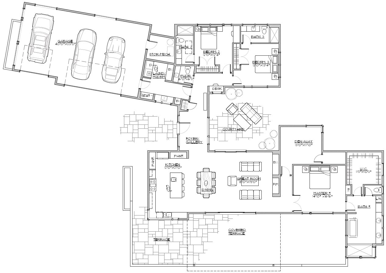 This one-story contemporary house plan boasts 2,818 square feet of heated living space. Sleek lines and interesting windows enhance the exterior of the home plan. Inside, the island kitchen flows into the dining area and the great room for one fantastic entertaining space! Expand any party to the covered terrace for a breath of fresh air. A quiet den would make a nice home office. Double doors introduce the luxurious master suite; note the garden tub in the private bath. Two more bedroom suites are found on the other side of the design. Don't overlook the handy desk and the three-car garage.