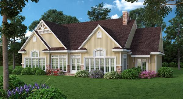 This one-story home is a super energy saver with lots of options. The plan is designed with a bonus space above the garage that can be used as a bedroom, game room or office. The bonus space has a private bath and convenient entry from the main level. An outdoor living room and kitchen are available as an option, making this a perfect home for enjoying outdoor dining and entertainment. The home is designed to capture free energy from the sun with the right orientation. The sunroom allows one to be warm and cozy on those cold winter days but it also serves as a passive-solar collector to lower those heating bills. The home is fully energy efficient, featuring 2x6 exterior walls and loads of other energy features that cost very little extra. The master suite features include a cathedral ceiling, a glorious master bath with twin walk-in closets and an adjoining swing room that can be used as an office, den, nursery or bedroom. Two other secondary bedrooms have large walk-in closets and share a jack & jill bath. One of the bedrooms has a large built-in desk, which is perfect for that diligent student. The living room features a window wall, fireplace and 12-ft. ceiling. The dining room has a cathedral ceiling and a china hutch niche. Typical ceiling heights are 9 ft. Built with a finished bonus room and the optional basement, this flexible plan expands to a 3 story mansion with 7 bed rooms and 5.5 baths.