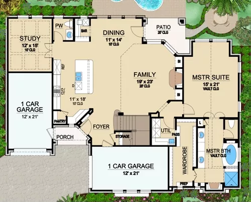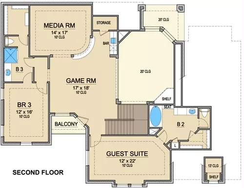 This classic luxury house plan is very open. When you enter the foyer, your eyes will immediately be drawn to the open kitchen, dining room and family room, separated only by the free-standing breakfast bar in the kitchen. The elegant dining room has a bank of windows in the rear, a bar, and access to the patio. A quiet study with coffered ceiling and one-car garage complete this side of this luxury house plan. The master suite sits quietly at the opposite side with vaulted ceiling, sitting area, master bath with his and hers sinks, separate shower, tub and large wardrobe. A pass-through in the wardrobe goes to the utility room. On the upper floor, a family bedroom with tray ceiling, large walk-in closet and full bath shares space with media and game rooms and a large guest suite with walk-in closet and spacious bathroom.