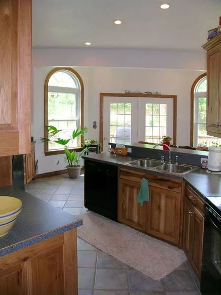 This is a variation of plan 2798 with a walk-out basement. The exterior of this classic one-story provides an interesting blend of Country charm with formal elegance. The interior utilizes dramatic angles to create a uniquely distinctive flow of rooms. The spacious Great Room features a stepped ceiling, a built-in media center and a striking fireplace. Lovely French doors within a rear bay lead to a big backyard patio. The breakfast room, which shares an eating bar with the kitchen, boasts a ceiling that slopes to 12 feet. French doors access a covered rear porch. The master bedroom has a 10-ft. tray ceiling, a sunny bay window and a roomy walk-in closet. The master bath features a whirlpool tub in a bayed nook and a separate shower. The front-facing Bedroom no. 3 is enhanced by a 10-ft.-high vaulted area over an arched transom window.