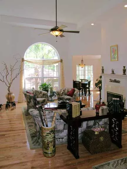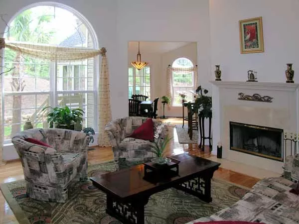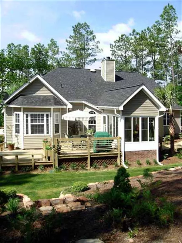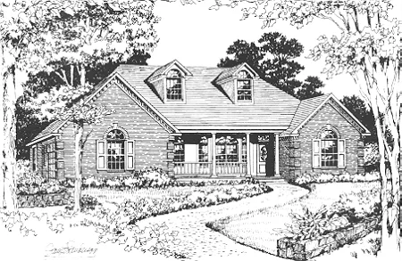 With decorative brick quoins, a columned porch and stylish dormers, the exterior of this classic one-story provides an interesting blend of Country charm with formal elegance. The interior utilizes dramatic angles with high ceilings to create a uniquely distinctive flow of rooms. See plan no. 6069 for a walk-out basement version. The spacious Great Room with lovely French doors, within a rear bay, leads to a big backyard patio. The breakfast room, which shares an eating bar with the kitchen, boasts a ceiling that slopes to 12 feet. French doors access a covered rear porch. The master bedroom has a 10-ft. tray ceiling, a sunny bay window and a roomy walk-in closet. The master bath features a whirlpool tub in a bayed nook and a separate shower. The front-facing Bedroom no. 3 is enhanced by a 10-ft.-high vaulted area over an arched transom window.