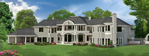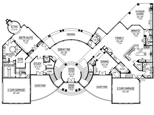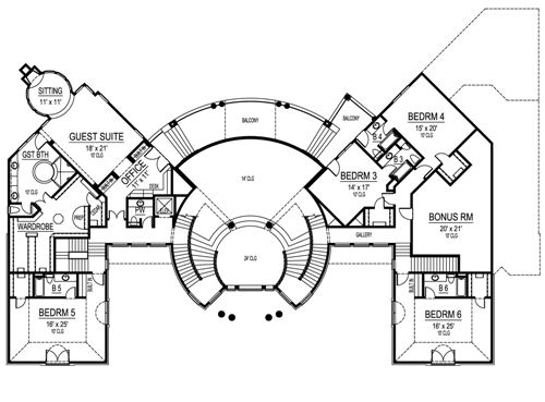This home plan's large decorative pillars are distinctive inside and out. The grand foyer is stunning, and all rooms fan out from the rounded center. The great room offers a bar and a bank of windows for views onto the veranda at the back of this mansion house plan. The family room has built-ins and a warming fireplace to help keep the kitchen and breakfast area cozy. A free-standing island and a breakfast bar serve the family room and breakfast area. The pantry and the utility room are adjacent to the butlery and the elegant dining room for ease in serving. The left wing houses the master suite, boasting a circular sitting area with fireplace; the lavish master bath flaunts his and hers sinks, a whirlpool tub and a shower for two. A gym and a large wardrobe complete this luxurious master suite. A quiet study is right outside the master suite. Two two-car garages flank the courtyards and grand entry to this luxurious mansion house plan. Upstairs, four family bedrooms with walk-in closets, built-ins, and full baths share space with a bonus room. A large guest suite mirrors the master suite on the first floor. These two rooms could be switched if you have elderly in-laws, allowing them to remain on the main level. A third level of the home contains a media room with a balcony.