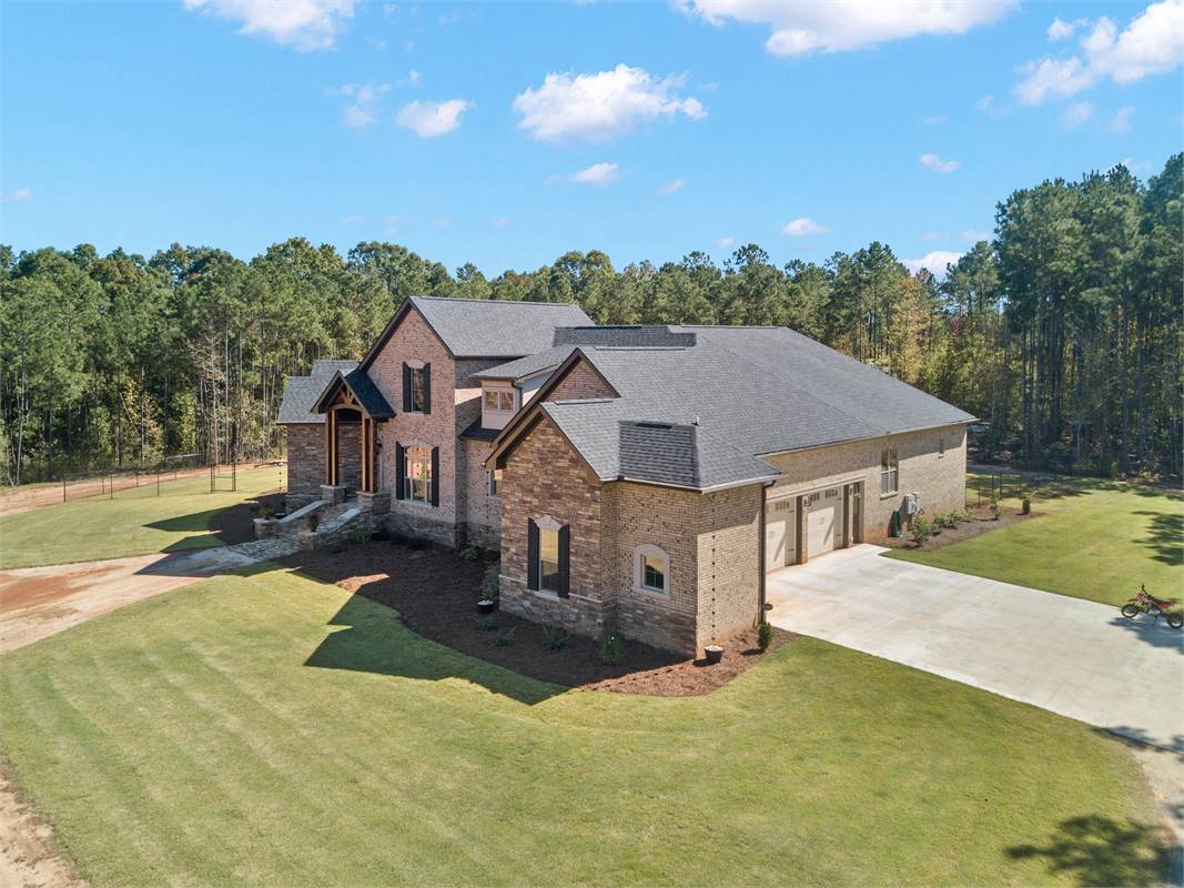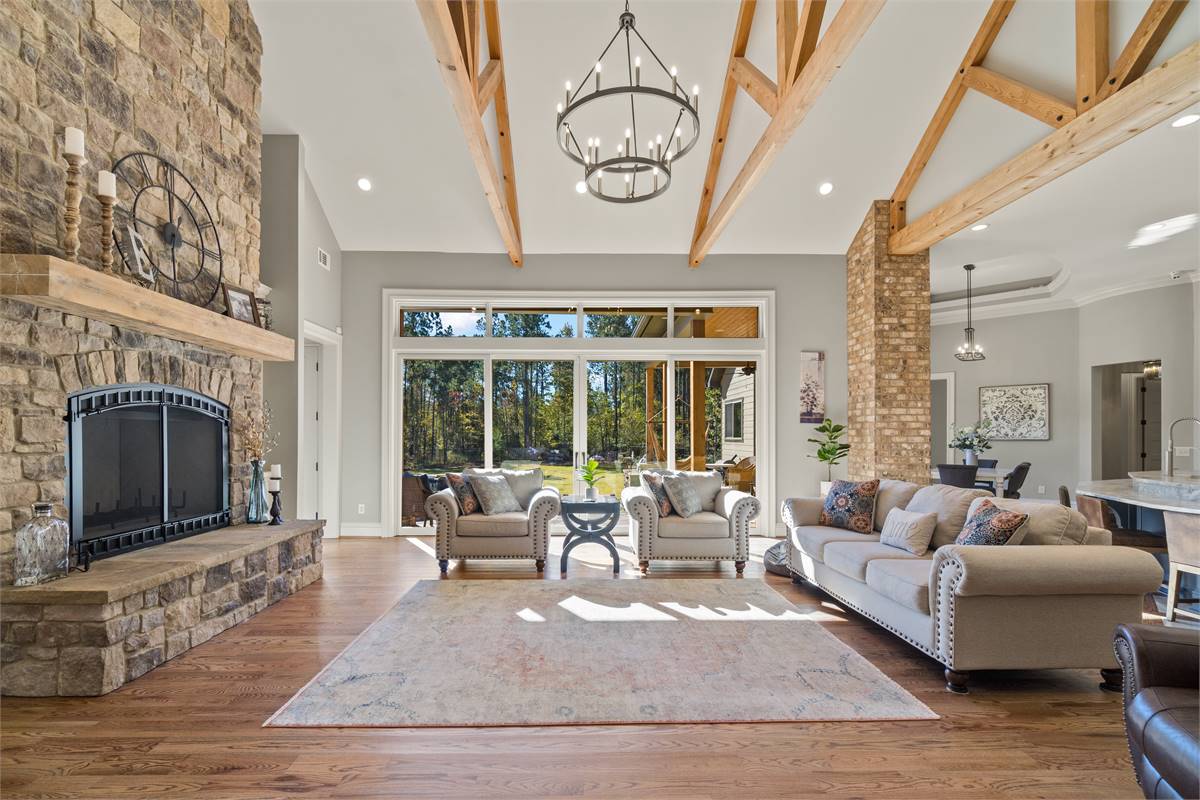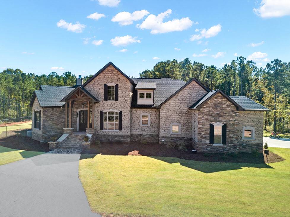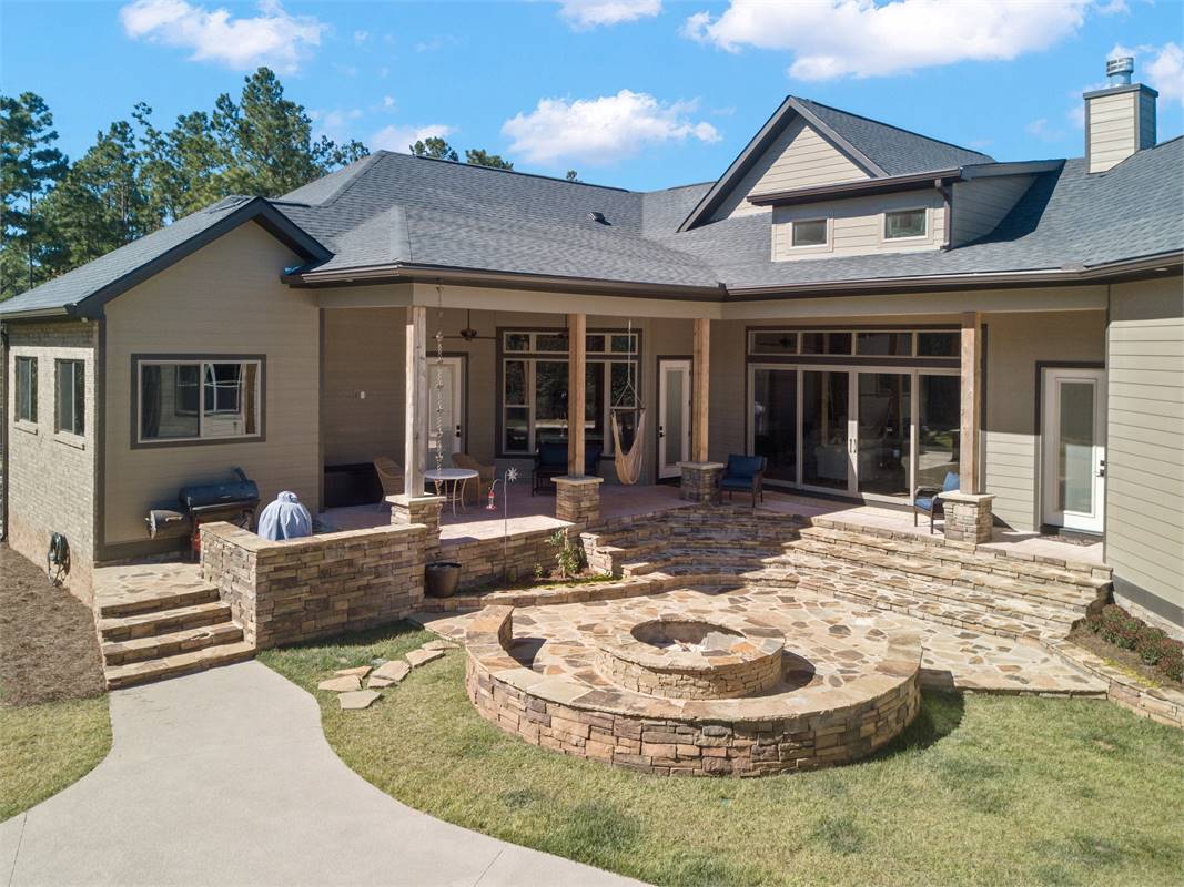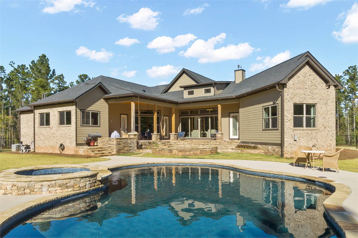Customer Built European Inspired Craftsman Home View Interior & Exterior Customer Built New Home Tour! Front View, Customer Modified Customer Added Beautiful Freeform Pool & Hot Tub A Large Covered Rear Patio Perfect for Family Gatherings Designer’s Rendering of Front View Covered Front Entry with Stone and Craftsman Design Front Right Aerial View with Triple Garage Entry Rear View Featuring Rounded Stone Wall Around Pool Full Rear Aerial View Rear Outdoor Living Featuring Fire Pit Left Side View Designer’s Right Side Rendering Showing 3-Car Garage Rear Outdoor Living Aerial View Aerial Roof View Double Entry Front Door Leads to Foyer with Coffered Ceiling Vestibule Featuring Wine Cooler and Gorgeous Chandelier Kitchen with Buchanan Hardwood and Floor & Decor Tile Kitchen with Custom Hood and Backsplash Homeowner Selected Stainless Gas Cooktop Commercial Grade French Door Refrigerator A Large Kitchen Island Adds Extra Seating & Countertop Space Open Concept Design Seamlessly Connects Living Space Kitchen Featuring Kohler Pulldown Faucet and Farmhouse Sink Dining Area Adjacent to Kitchen – Great for Casual Dining Beautiful Pella Windows Allow Maximum Light Exposure Great Room with Built-Ins & Eldorado Stone Fireplace Great Room with Natural Wood Beams & Brick Columns Striking 12’ Vaulted Great Room Ceiling Adds Ambience Transom Windows Over Sliding Glass Doors Add Light Game and Card Room with Unique Ceiling Detail Game Room with Access to Hallway and Casual Dining Area Powder Bath Located by Game Room Primary Bedroom with Natural Timber & Dropped Ceiling Primary Ensuite Bath with Double Sink Vanity & Walk-in Shower Primary Bath Shower with Overhead Rain Shower Head Bedrooms 3 & 4 Jack and Jill Style Bathroom Spacious Bedroom 2 with Ensuite Bathroom Bedroom 3 with Access to Jack and Jill Bath Bedroom 4 with Access to Jack and Jill Bath Study with Upstairs Loft for Books Spiral Staircase to Upstairs Loft in Study Laundry Room with Pet Bed & Extra Storage for Seasonal Items Built in Georgia with Customer Preferred Pella Windows Rustic French Country with Craftsman Elements Vaulted Columned Front Porch with Double Door Entryway Patio Featuring Cultured Stone Country Ledgestone First Floor Plan