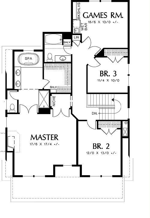 Double doors open to the den, to a rear porch, to the master salon, to the master bath and to the games room. Plans for a detached garage are included with the blueprints for the home.