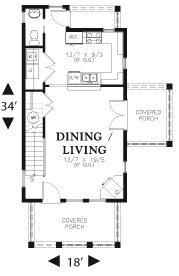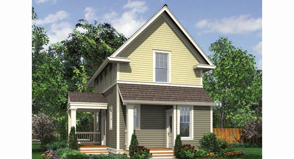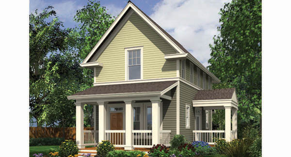 This variation on 21117 adds two gorgeous, covered porches; the side porch, off the open dining/living space, offers a splendid sitting/entertaining area and instills the home with grace while an extended back porch (off the kitchen) provides supplementary outdoor space. Indoors: the downstairs living area features an airy living/dining room, an amenity-rich kitchen, a half-bath, a cleverly tucked-away utility closet and 9 ceilings. Two spacious, vaulted bedroom suites and plenty of storage fill the gable-roofed, second level. With its narrow layout and sharply triangular roofline, The Nalley is remarkably upscale for its modest size.