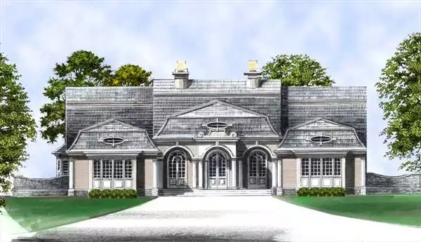 The arched portico, twin chimneys, and three oval windows add up to one beautifully symmetrical facade. The foyer is flanked by the dining room on the right and parlor on the left. Directly ahead is the family room with access to the rear arbor, and to the right you'll find the kitchen and bayed breakfast nook. The left side of the plan is devoted to three of the four bedrooms, including a lavish master suite. The master bath includes a separate tub and shower, dual-sink vanity, and a thoughtfully compartmented toilet. A secluded fourth bedroom and private bath are tucked behind the two-car garage.